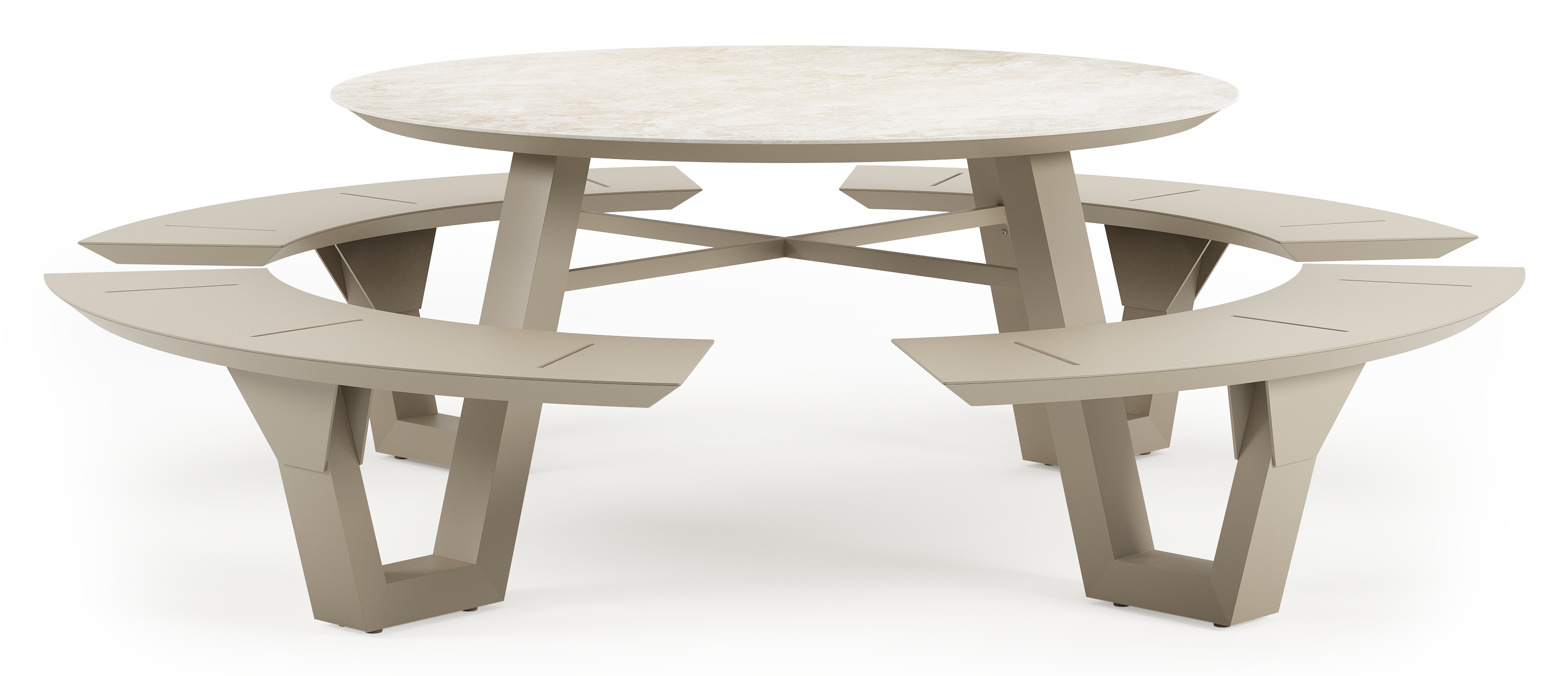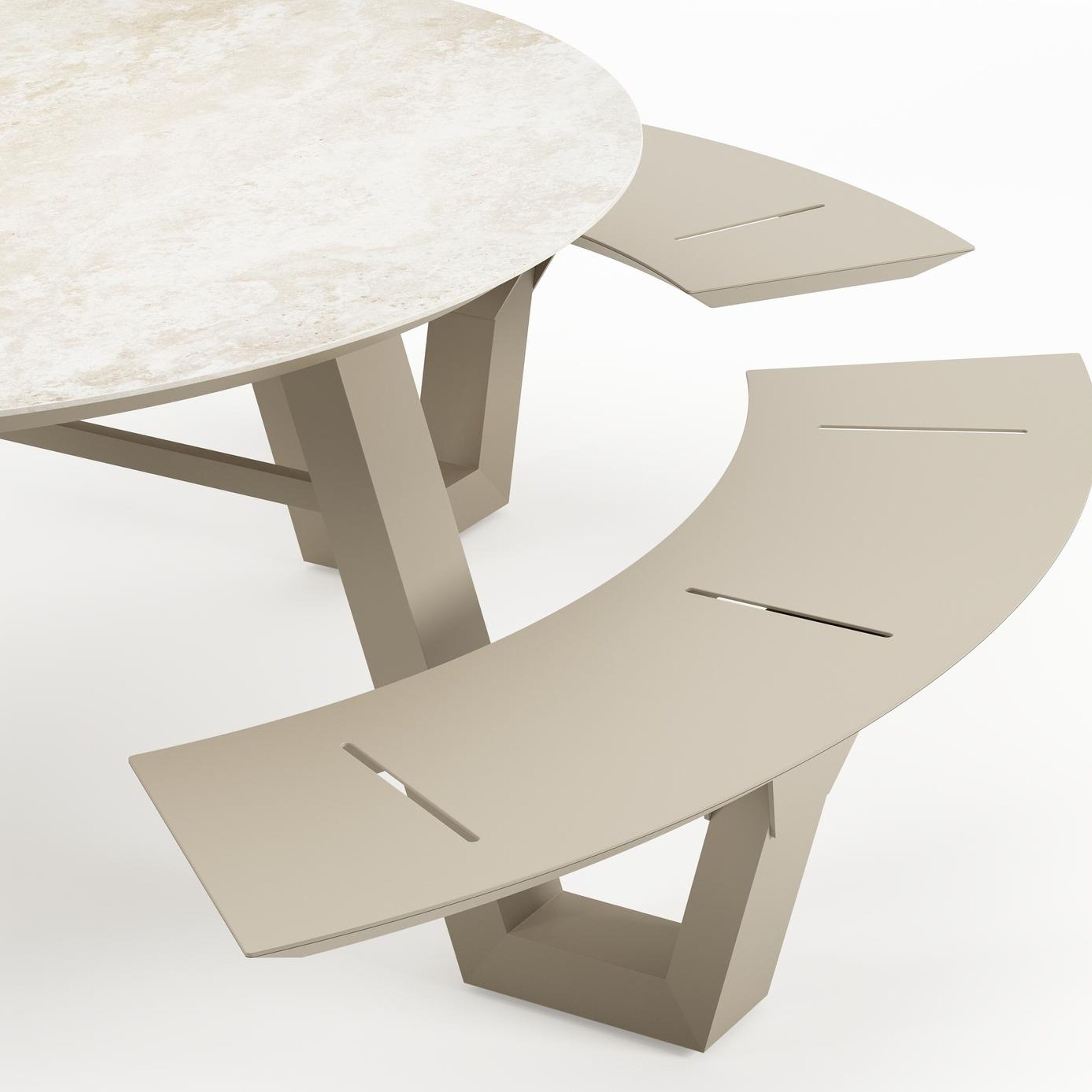 De Rondino picknicktafel omarmt een minimalistisch design met een robuuste look. De langwerpige banken sluiten naadloos aan op het frame van de tafel, waardoor een gestroomlijnde en samenhangende look ontstaat. De ronde vorm zorgt ervoor dat je gezellig met meerdere mensen bij elkaar kan zitten.