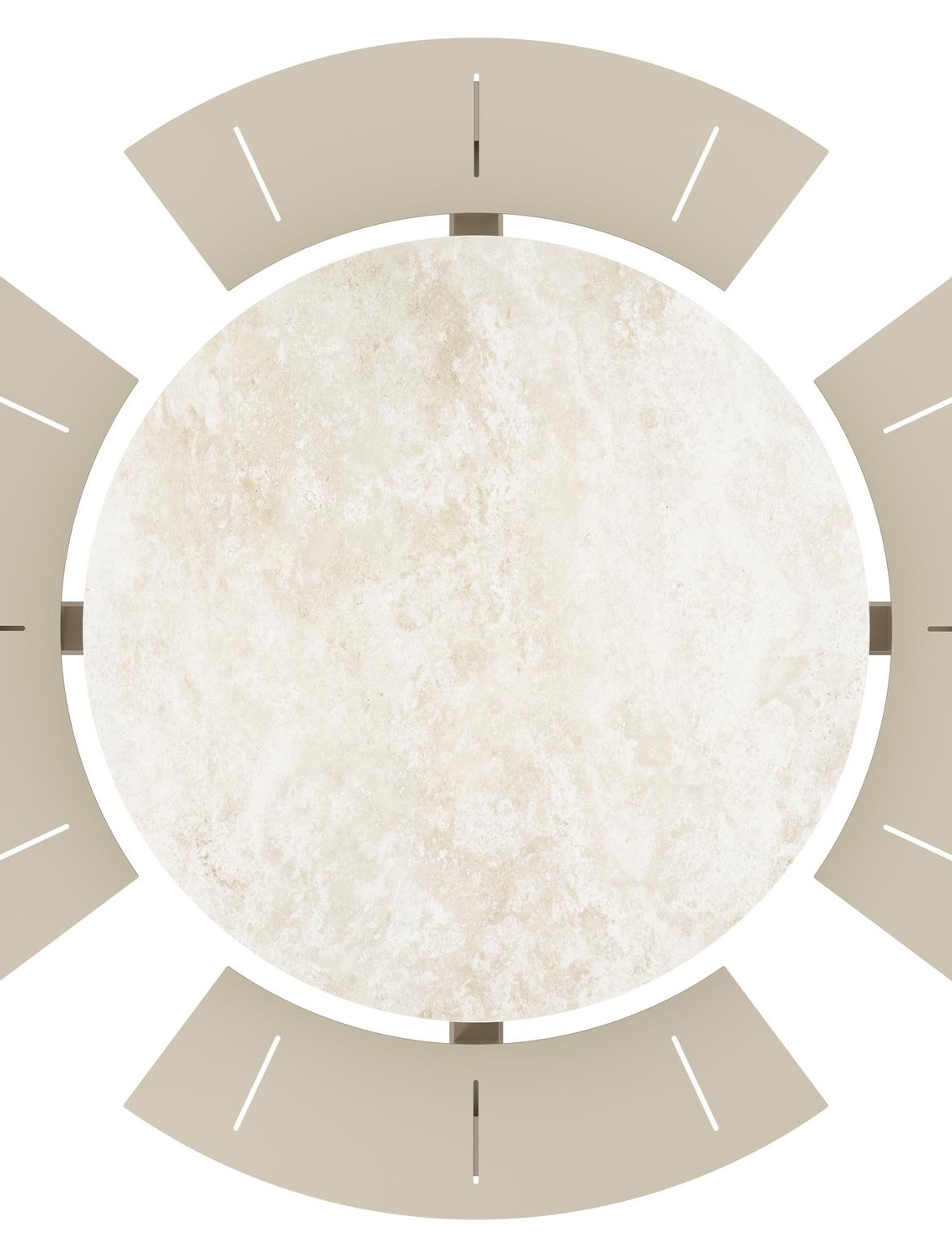 Het Rapolano tafelblad, een ode aan de serene Toscaanse thermale baden. De subtiele beige tinten en het verfijnde patroon, geïnspireerd op de organische bewegingen van de natuur, creëren een tijdloos en rustgevend geheel. Elk blad is uniek, met zachte kleur- en textuurovergangen die een gevoel van luxe en warmte uitstralen.