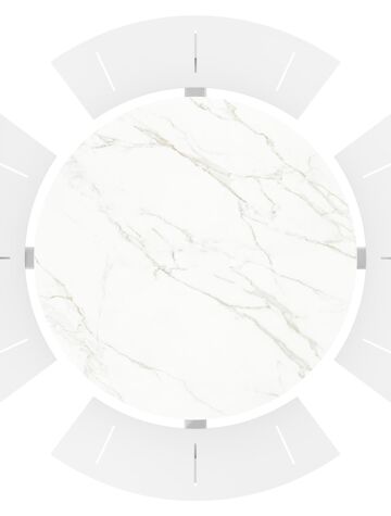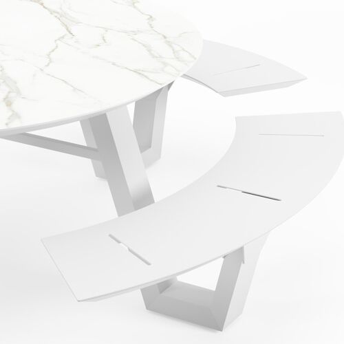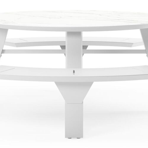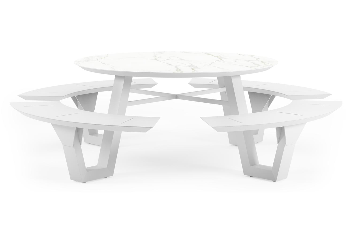 De Rondino heeft een trendy, minimalistisch uitstraling. De picknickbank is gemaakt uit aluminium een sterk, roestvrij materiaal. Deze tafel is afgewerkt met een Calacatta tafelblad. De basis van het blad is wit, maar is afgewerkt met grijze aders die een prachtige marmerlook creëren. Het voordeel van volkeramische tafelbladen is dat ze krasbestendig zijn en bestand zijn tegen alle weersomstandigheden.