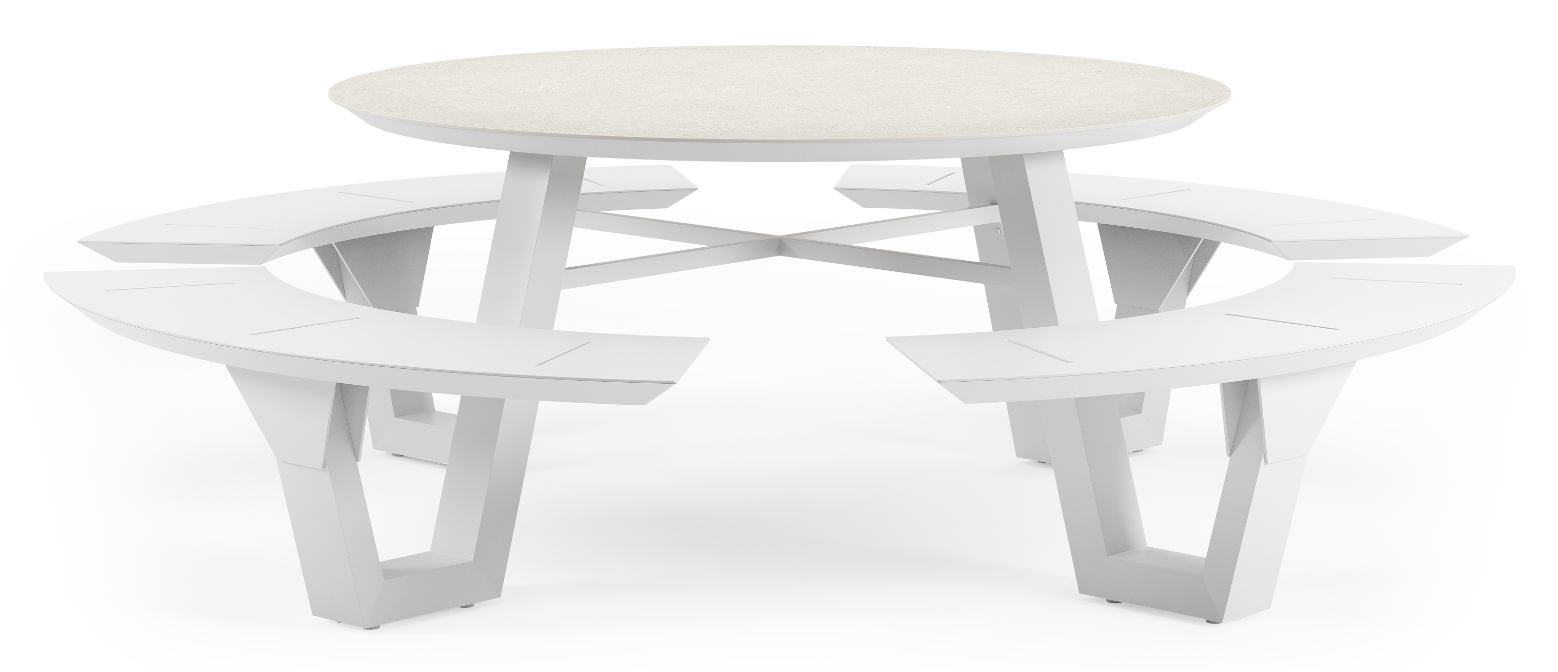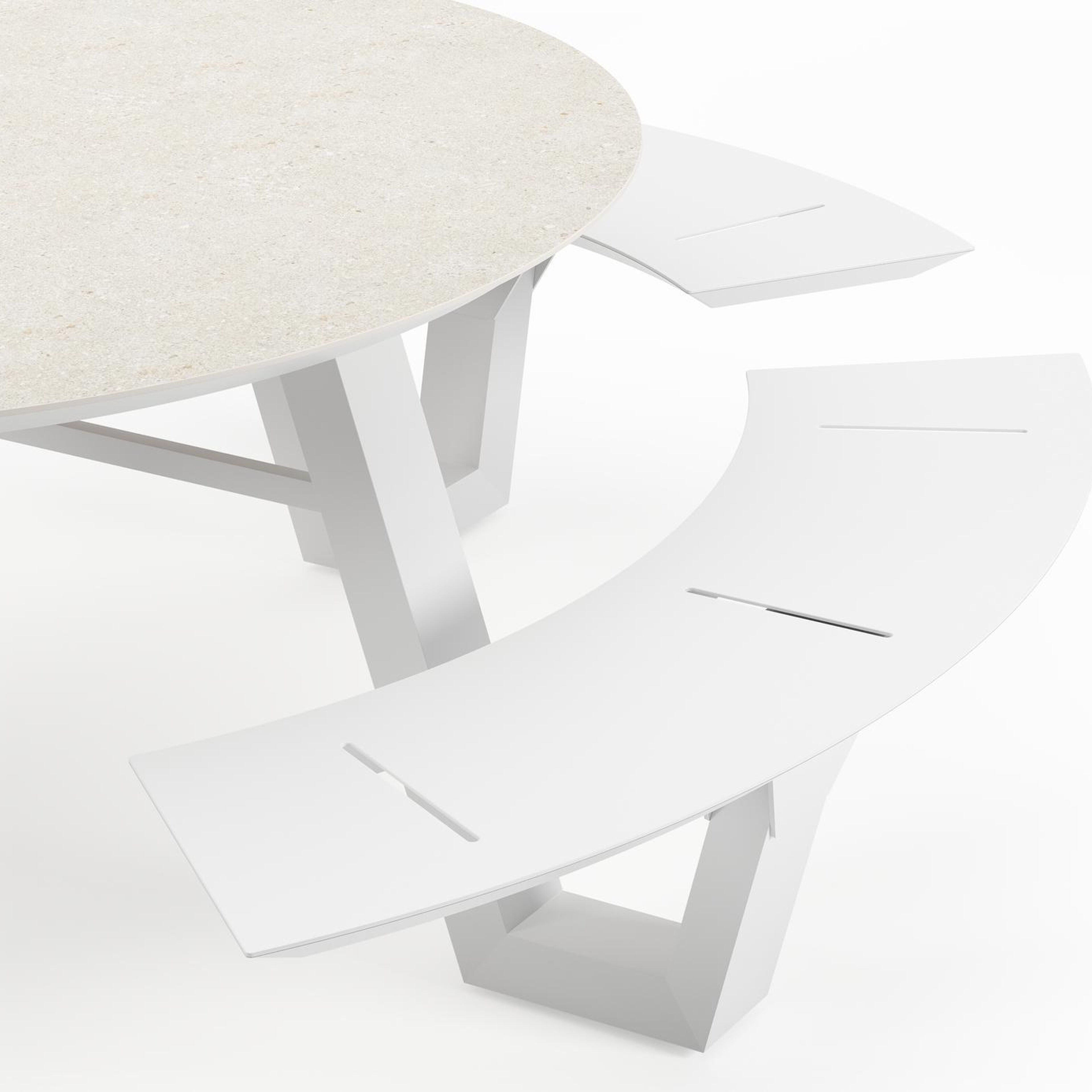 De Rondino heeft een trendy, minimalistisch uitstraling. De picknickbank is gemaakt uit aluminium een sterk, roestvrij materiaal. Deze tafel is afgewerkt met een Shilin tafelblad. Dit is een nieuwkomer in ons assortiment. De aardse kleurschakeringen passen perfect aan bij onze nieuwe outdoortrends. In het tafelblad is er een licht reliëf te voelen, waardoor het Shilin blad de look & feel heeft van echte natuursteen. In het blad is een fijne glinster aanwezig. Het voordeel van volkeramische tafelbladen is dat ze krasbestendig zijn en bestand zijn tegen alle weersomstandigheden.