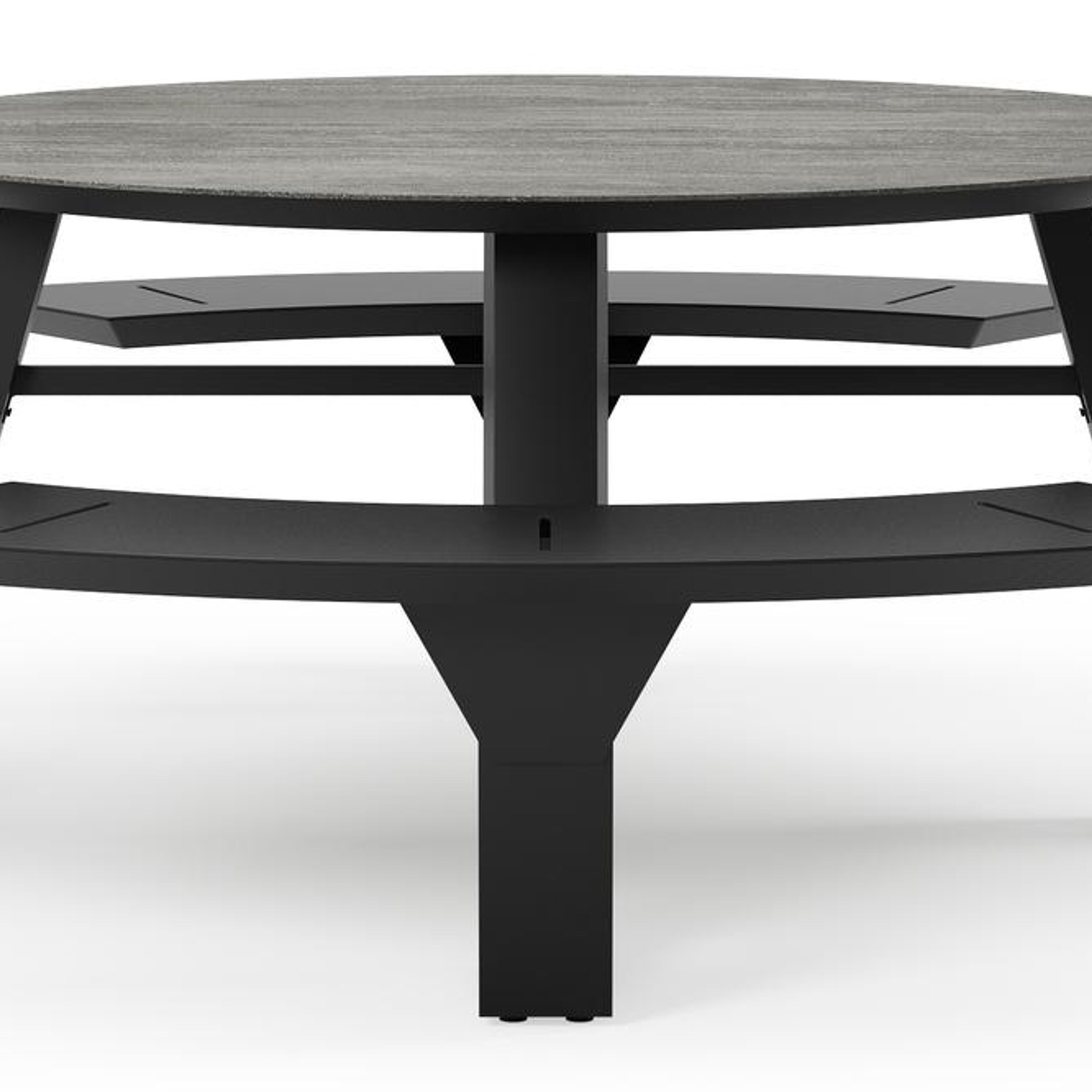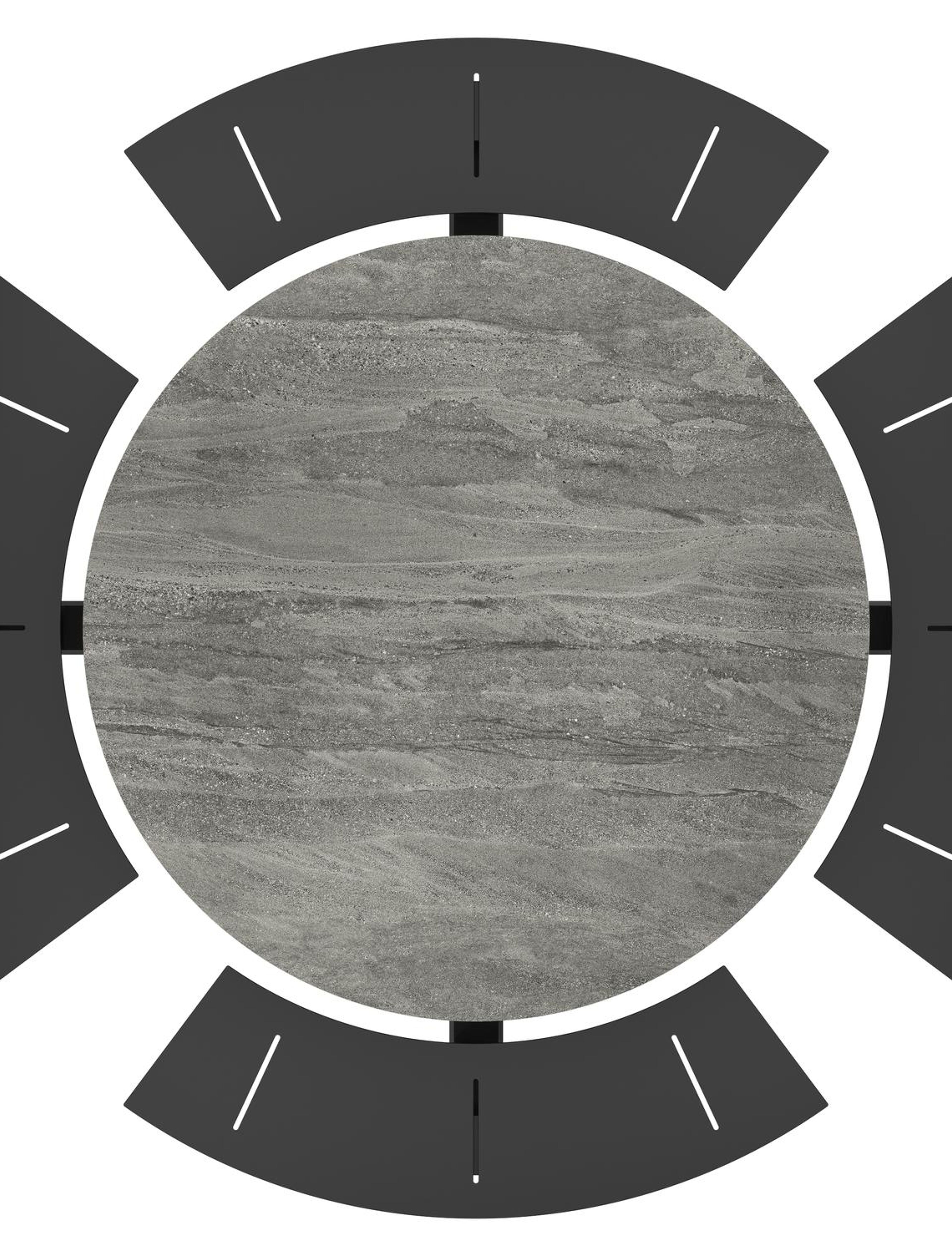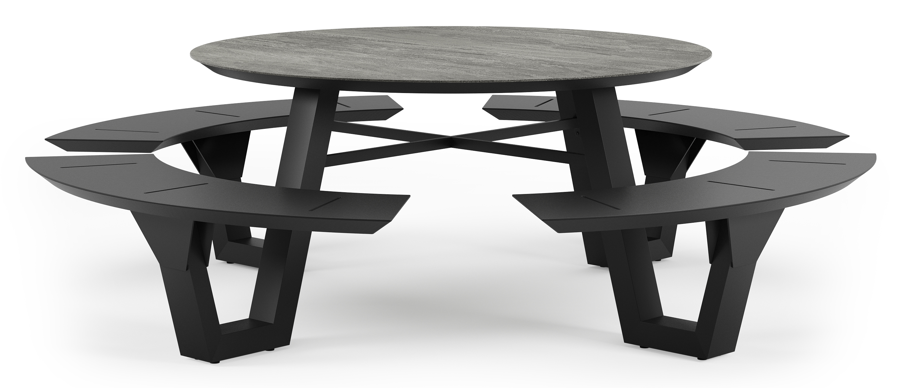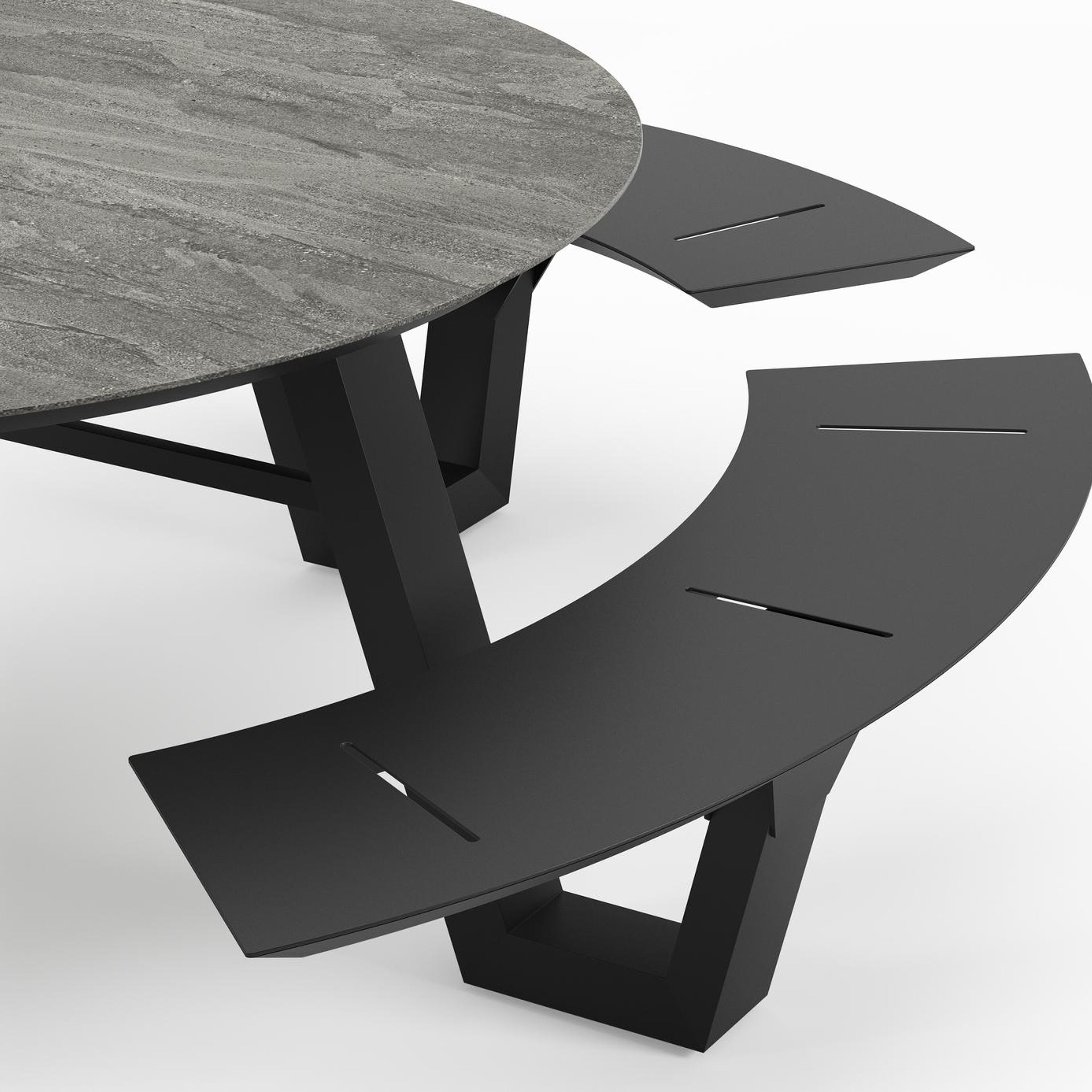 De Rondino heeft een trendy, minimalistisch uitstraling. De picknickbank is gemaakt uit aluminium een sterk, roestvrij materiaal. Deze tafel is afgewerkt met een Aspen Grey tafelblad. Het Aspen grey tafelblad is een mat tafelblad met grijszwarte kleurschakeringen. Het voordeel van volkeramische tafelbladen is dat ze krasbestendig zijn en bestand zijn tegen alle weersomstandigheden.