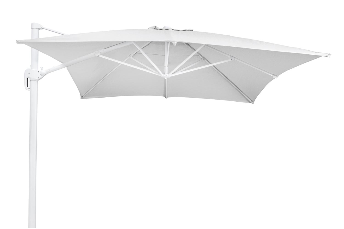 Luxe zweefparasol met mast en baleinen in wit gepoederlakt aluminium. Het doek is gemaakt in Sunbrella stof in All Weather kwaliteit met windvang. Kleur: Natte White. Zeer eenvoudig te openen dankzij de zwengel. De parasol is verstelbaar in verschillende standen en zeer compact inklapbaar met de handgreep. Draaibaar 360° rond zijn as. Inclusief kruisvoet (tegels of parasolvoet apart verkrijgbaar). Met beveiligingssysteem. Afmetingen doek: L 3 x B 4 m. Inclusief beschermhoes. Voor de parasolvoet raden we aan een minimumgewicht van 120kg te respecteren.
