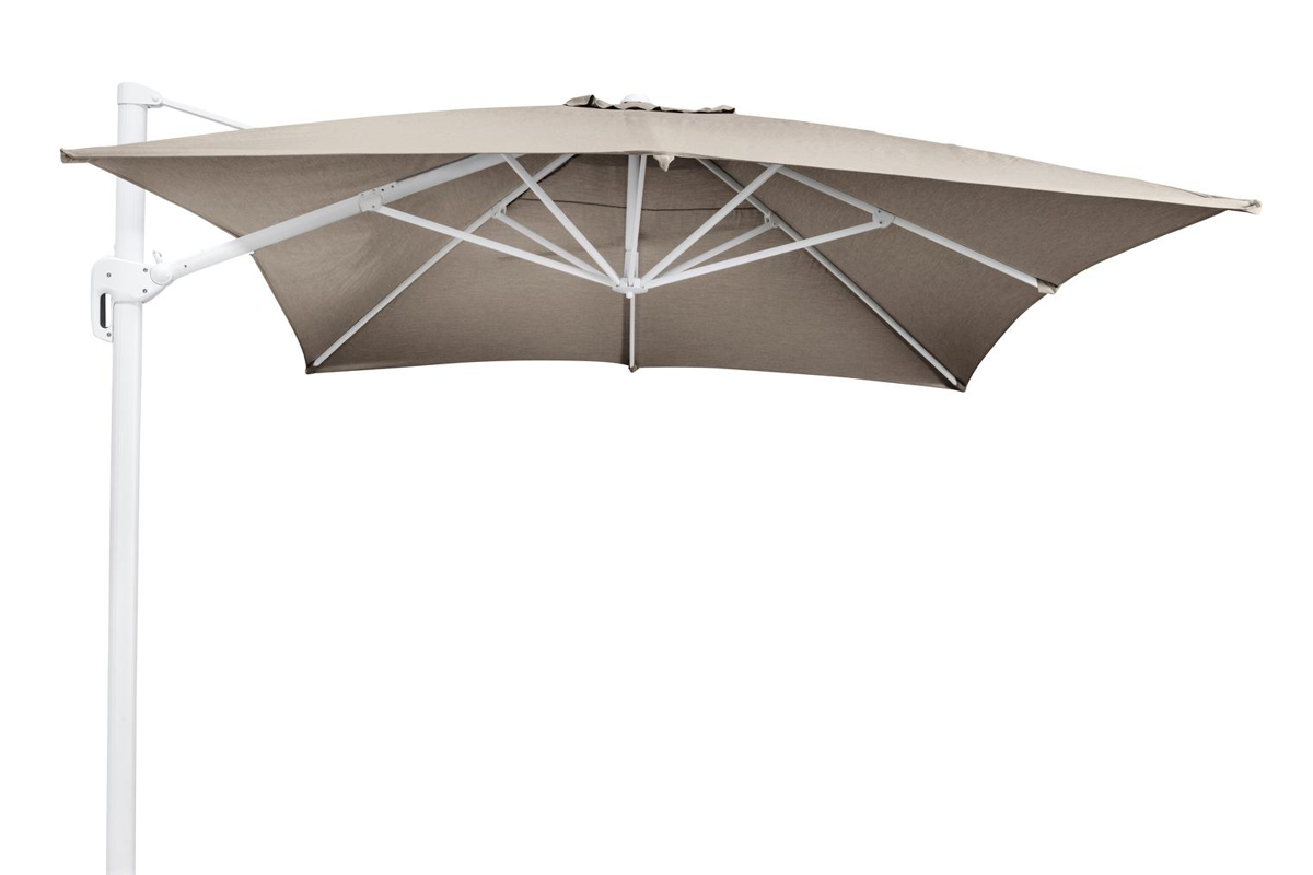 Luxe zweefparasol met mast en baleinen in wit gepoederlakt aluminium. Het doek is gemaakt in Sunbrella stof in All Weather kwaliteit met windvang. Kleur: Natte Heather Beige. Zeer eenvoudig te openen dankzij de zwengel. De parasol is verstelbaar in verschillende standen en zeer compact inklapbaar met de handgreep. Draaibaar 360° rond zijn as. Inclusief kruisvoet (tegels of parasolvoet apart verkrijgbaar). Met beveiligingssysteem. Afmetingen doek: L 3 x B 4 m. Inclusief beschermhoes. Voor de parasolvoet raden we aan een minimumgewicht van 120kg te respecteren. Voor de parasolvoet raden we aan een minimumgewicht van 120kg te respecteren.