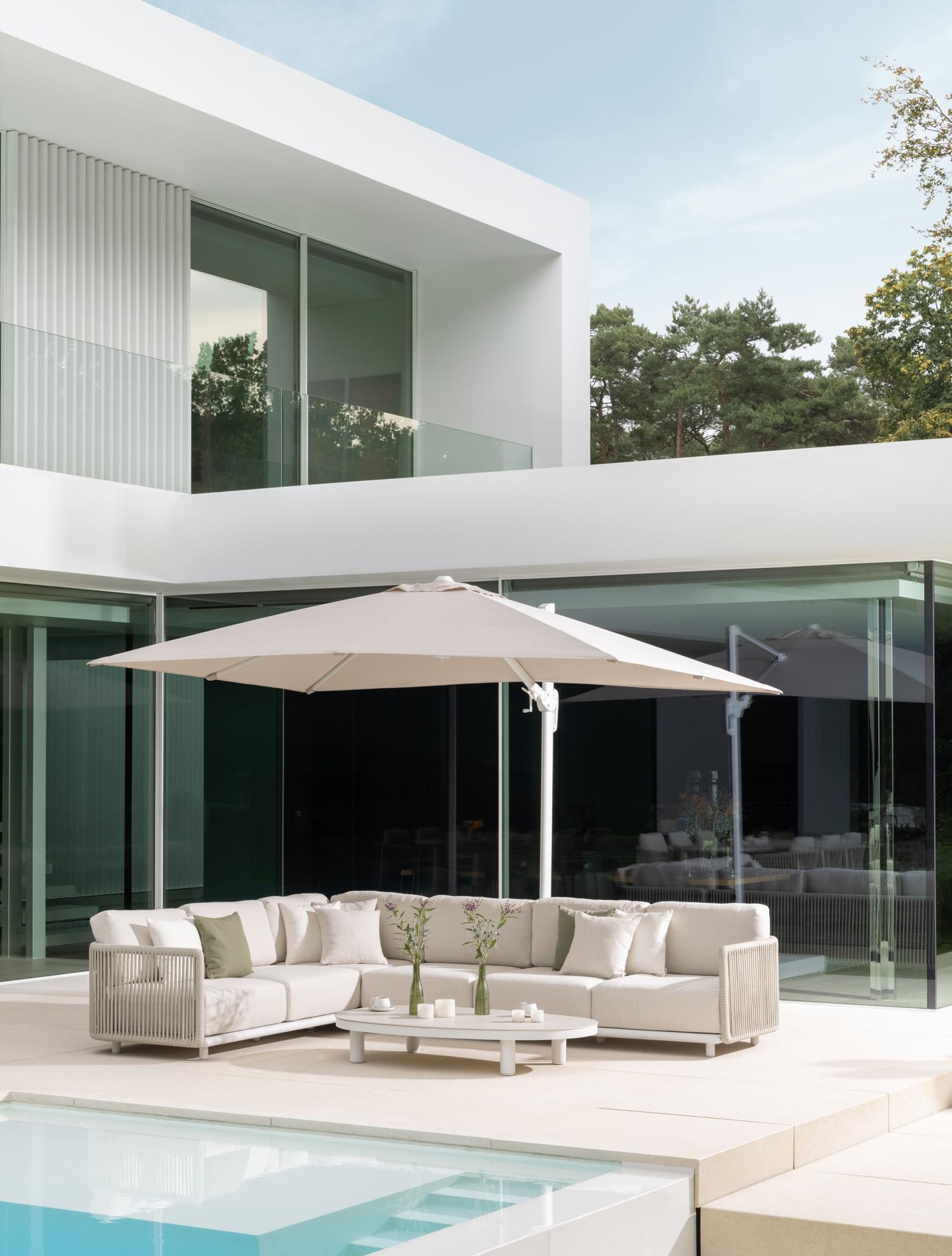 Het frame van de mast is gemaakt uit roestvrij aluminium. Het oppervlak is glad afgewerkt waardoor het geen vuil aantrekt en onderhoudsvriendelijk is. De poedercoating zorgt voor de UV- en weerbestendigheid van je meubel.