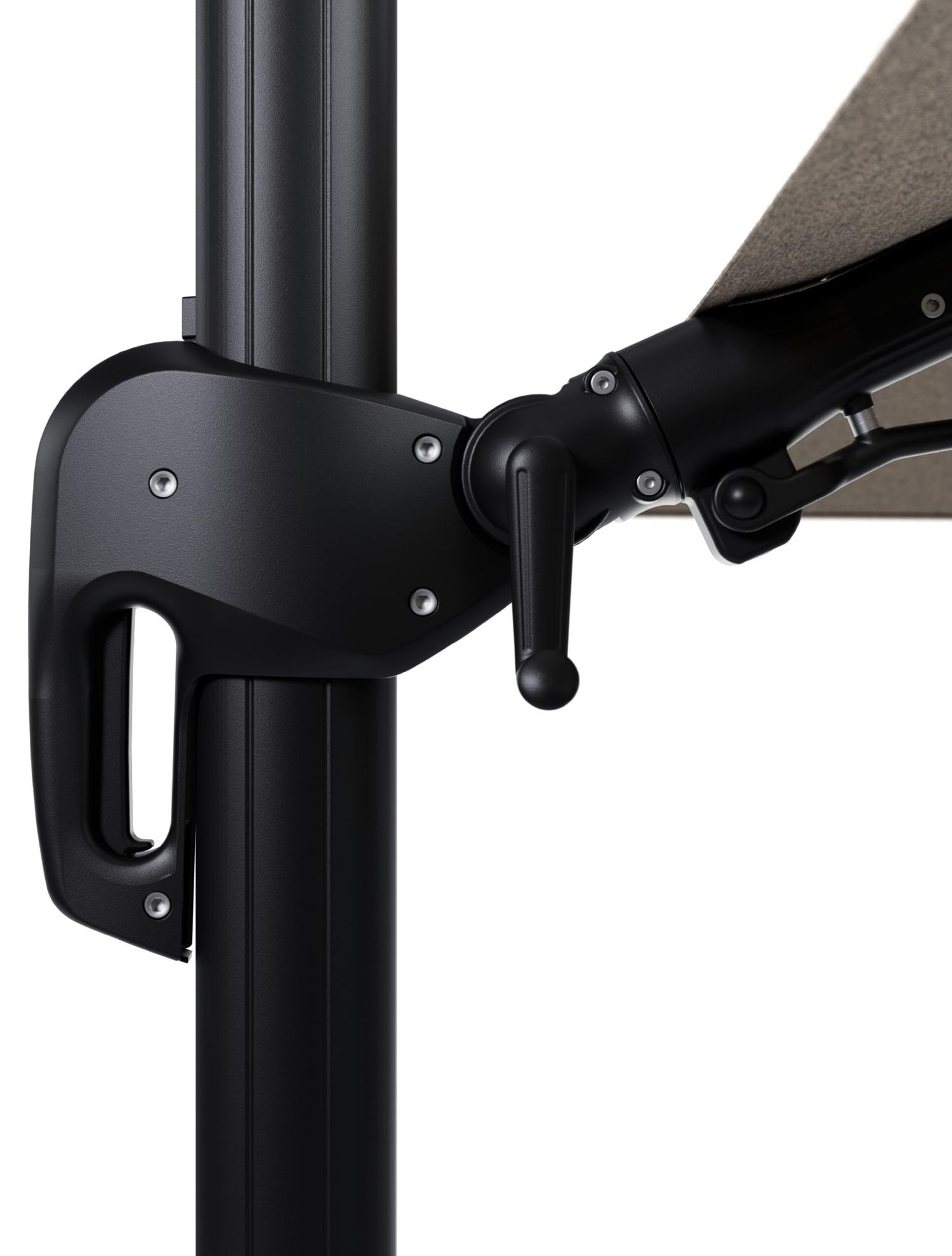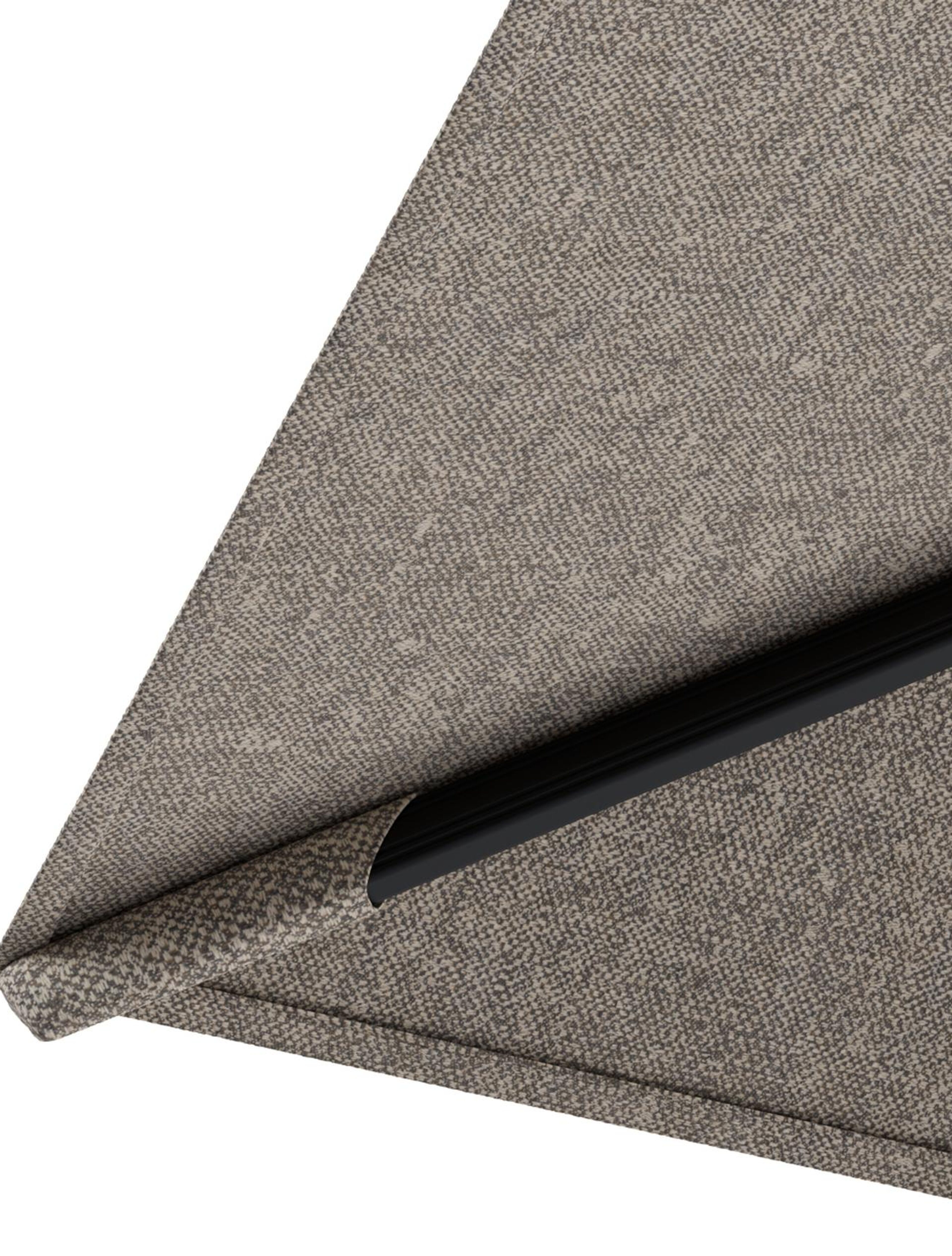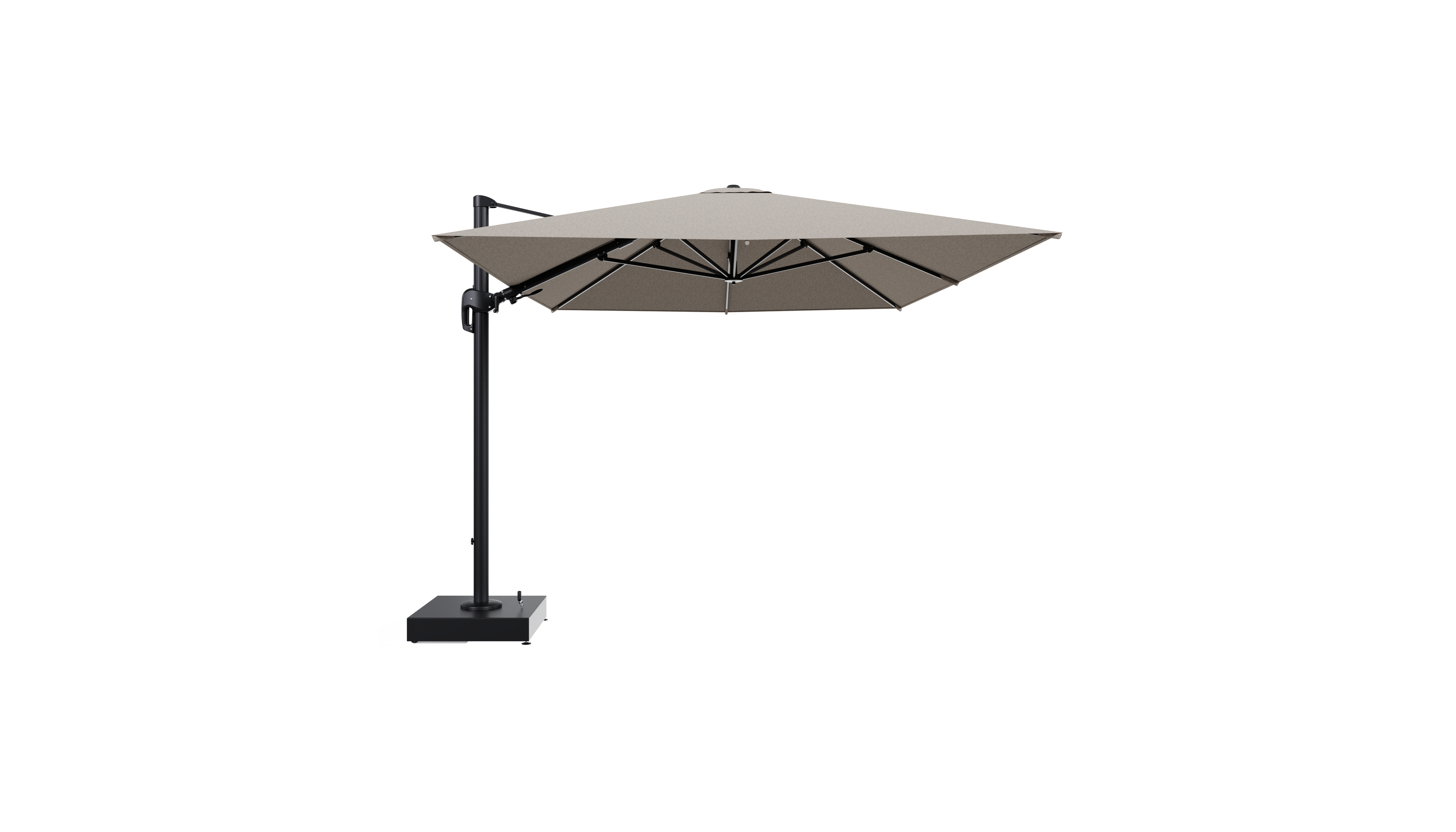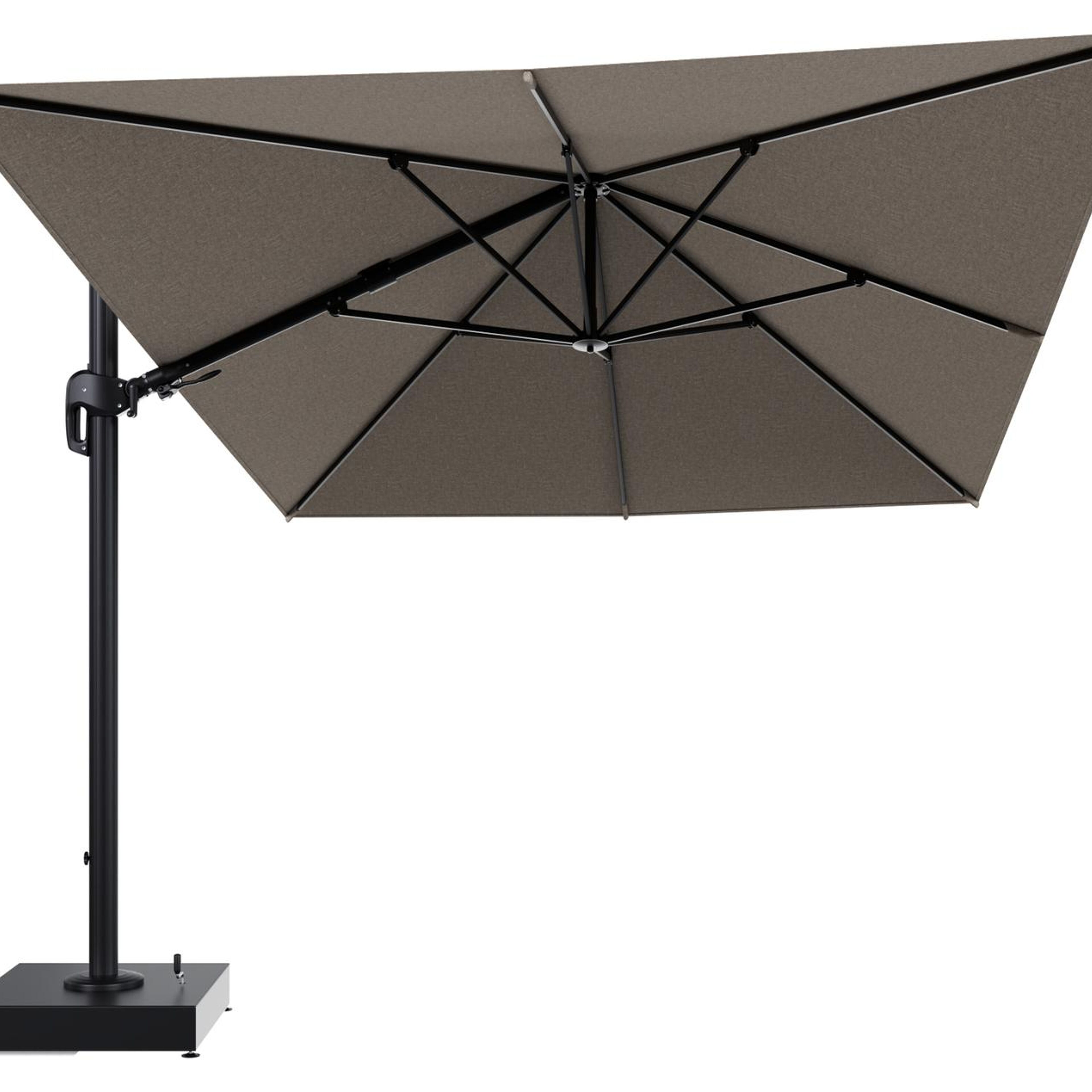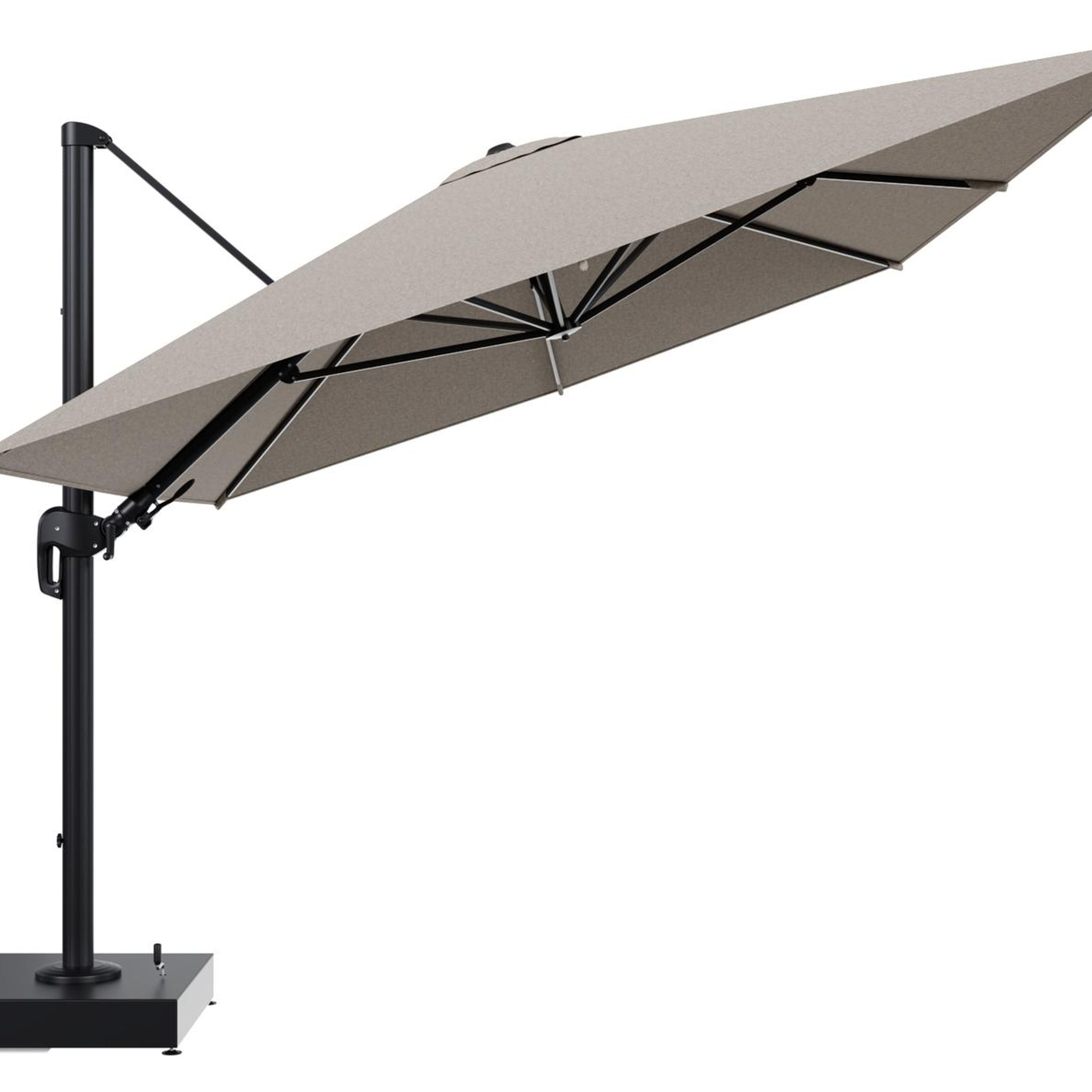 Rufina zweefparasol met tiltfunctie in zwart aluminium en Chartres Pewter All Weather Sunbrella® Luxe parasoldoek - L1 400 x L2 300 cm met parasolvoet Minore 150 kg met wielen | Exterioo tuinmeubelen