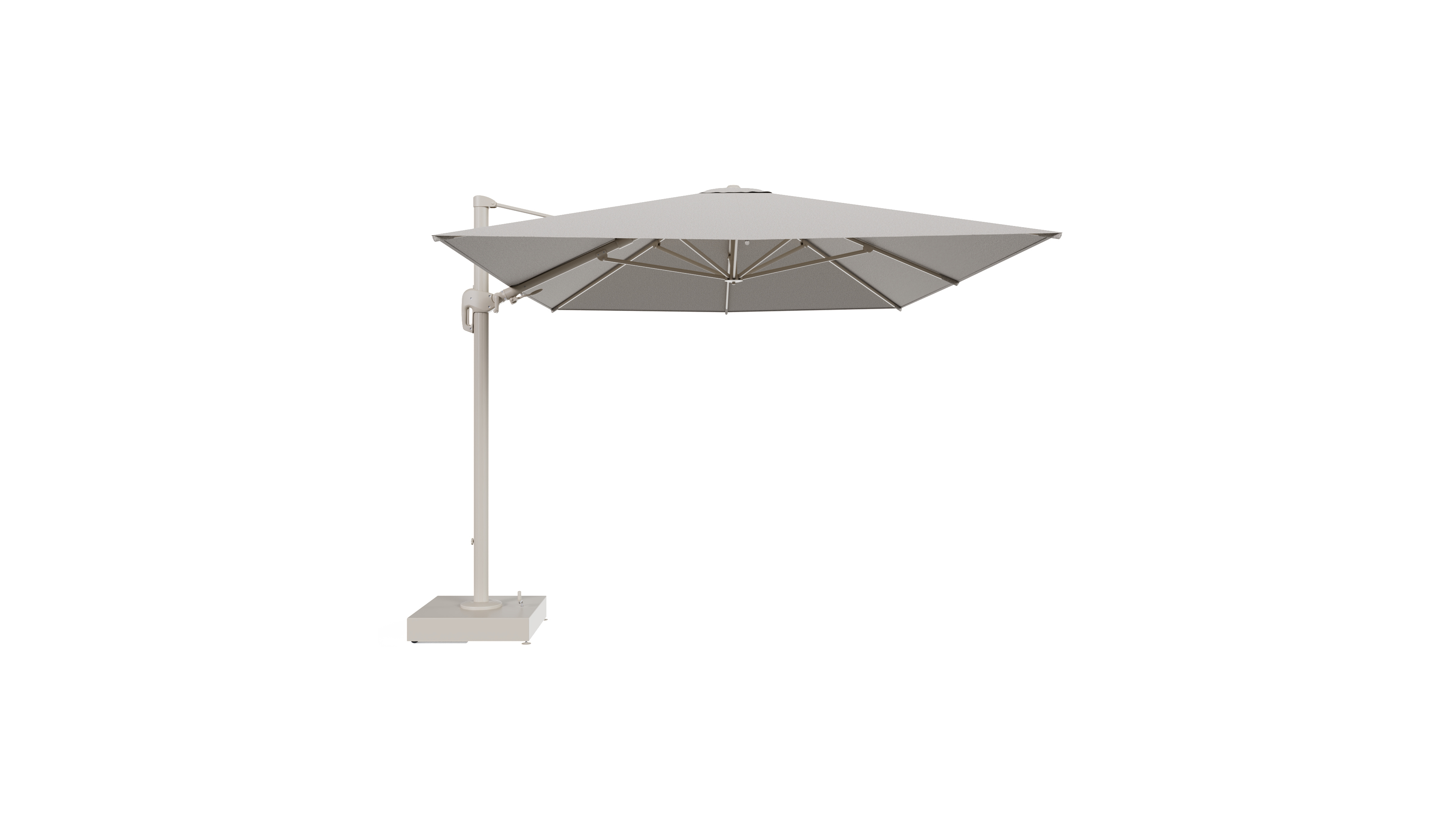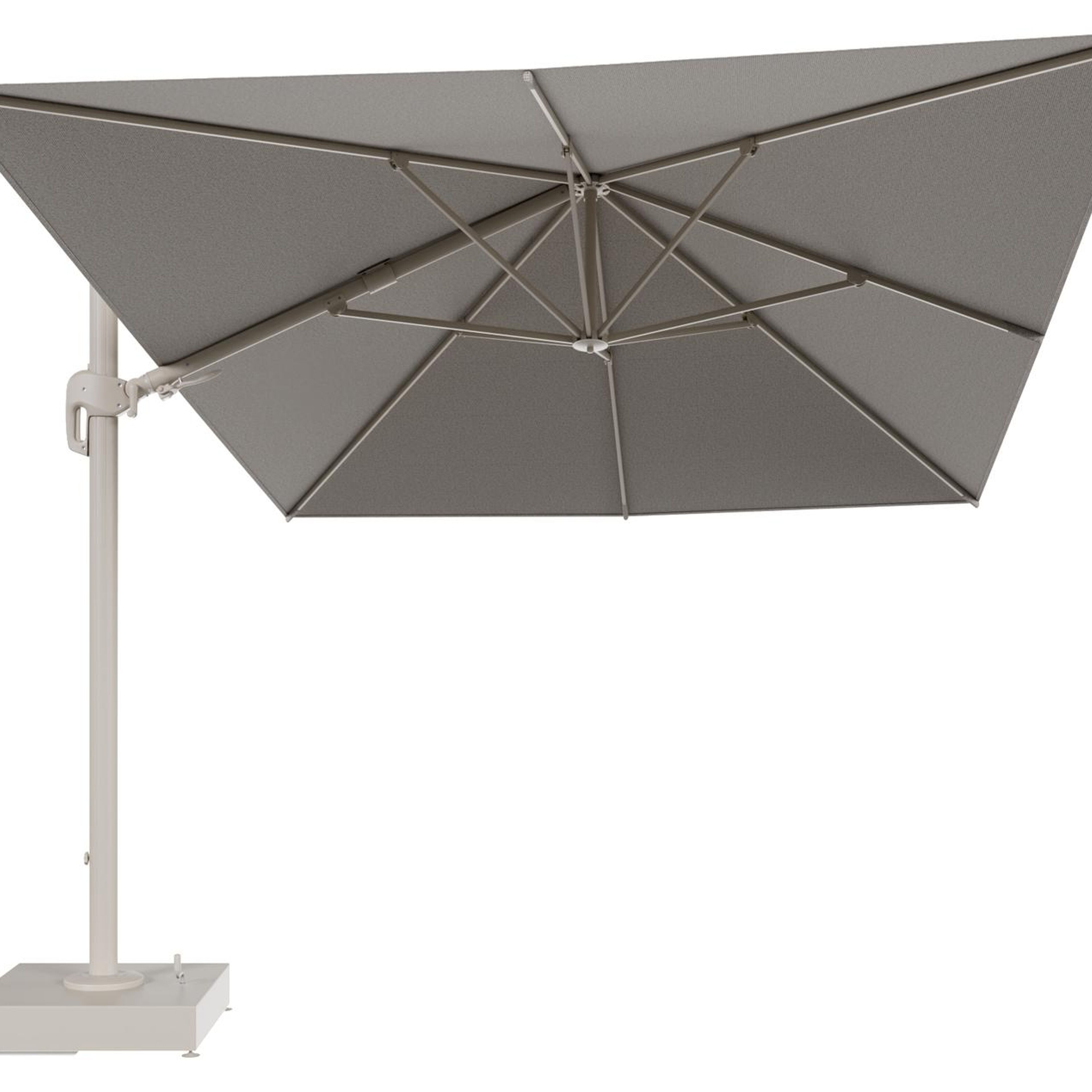 Rufina zweefparasol met tiltfunctie in beige aluminium en Firenze Sand All Weather Solica parasoldoek - L1 400 x L2 300 cm met parasolvoet Minore 150 kg met wielen | Exterioo tuinmeubelen