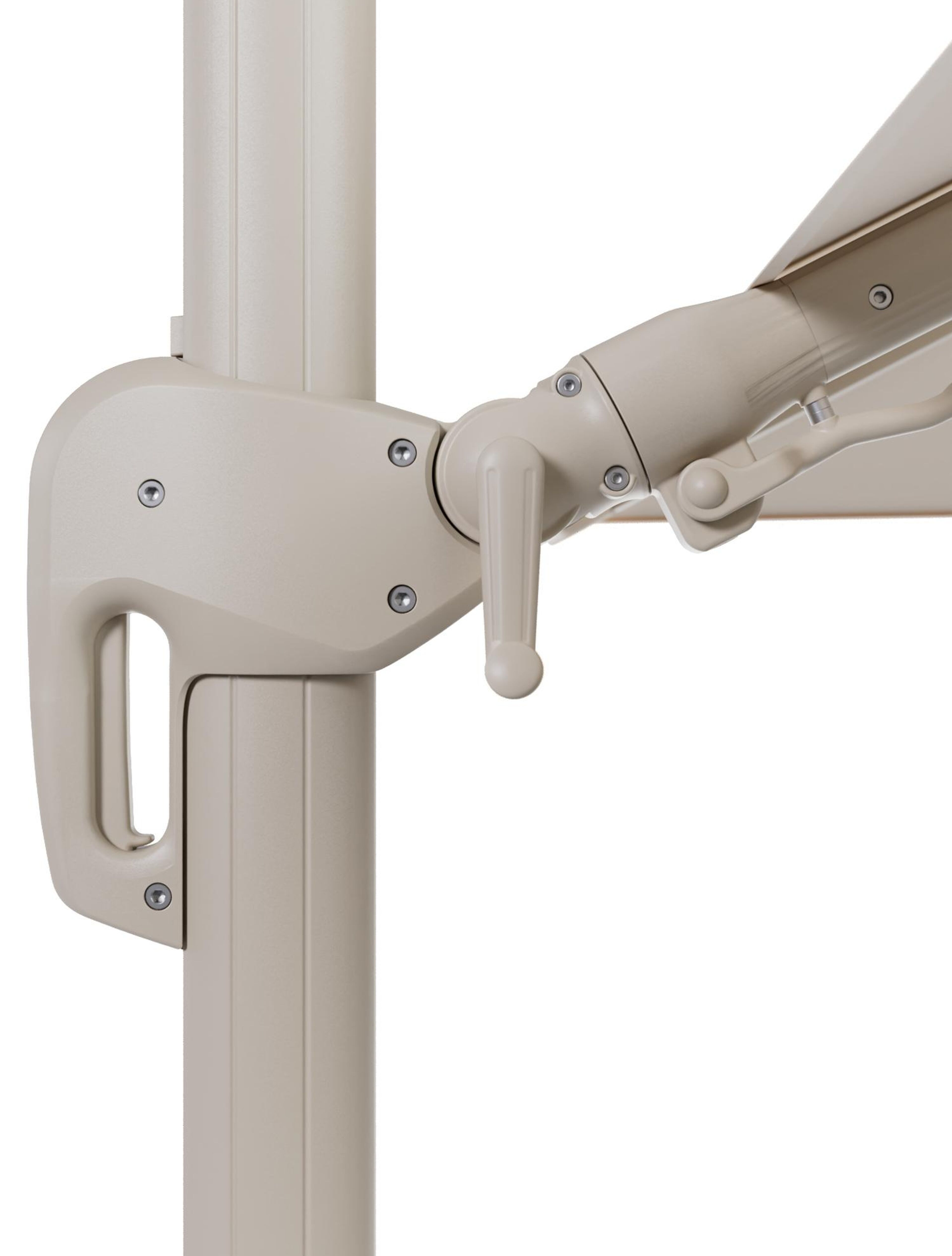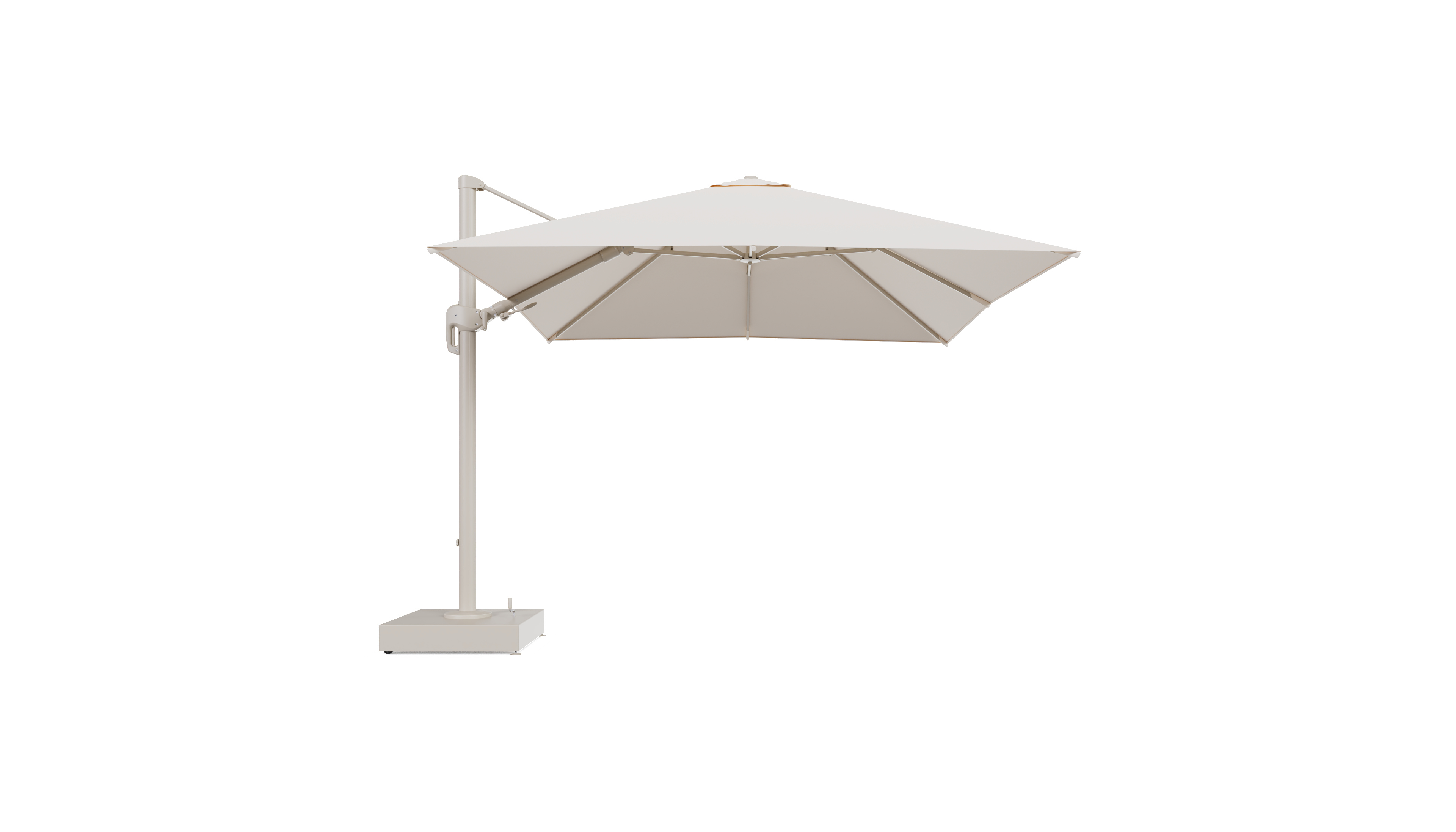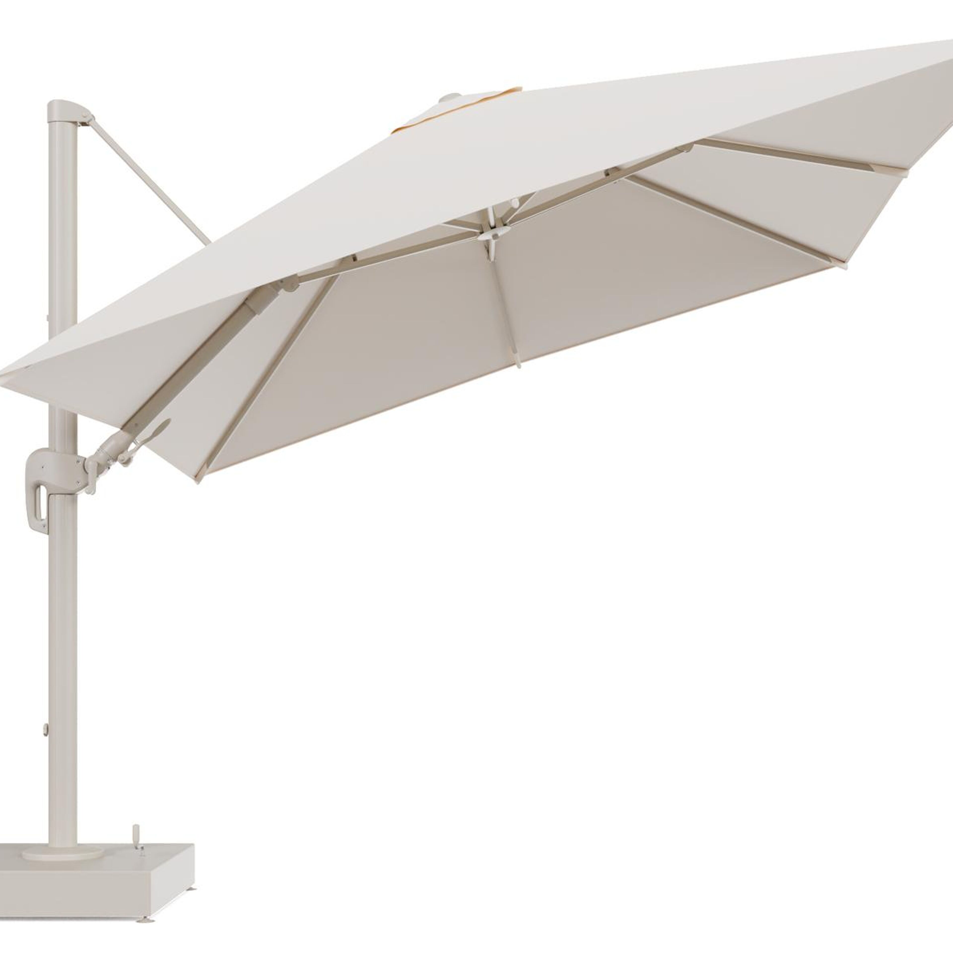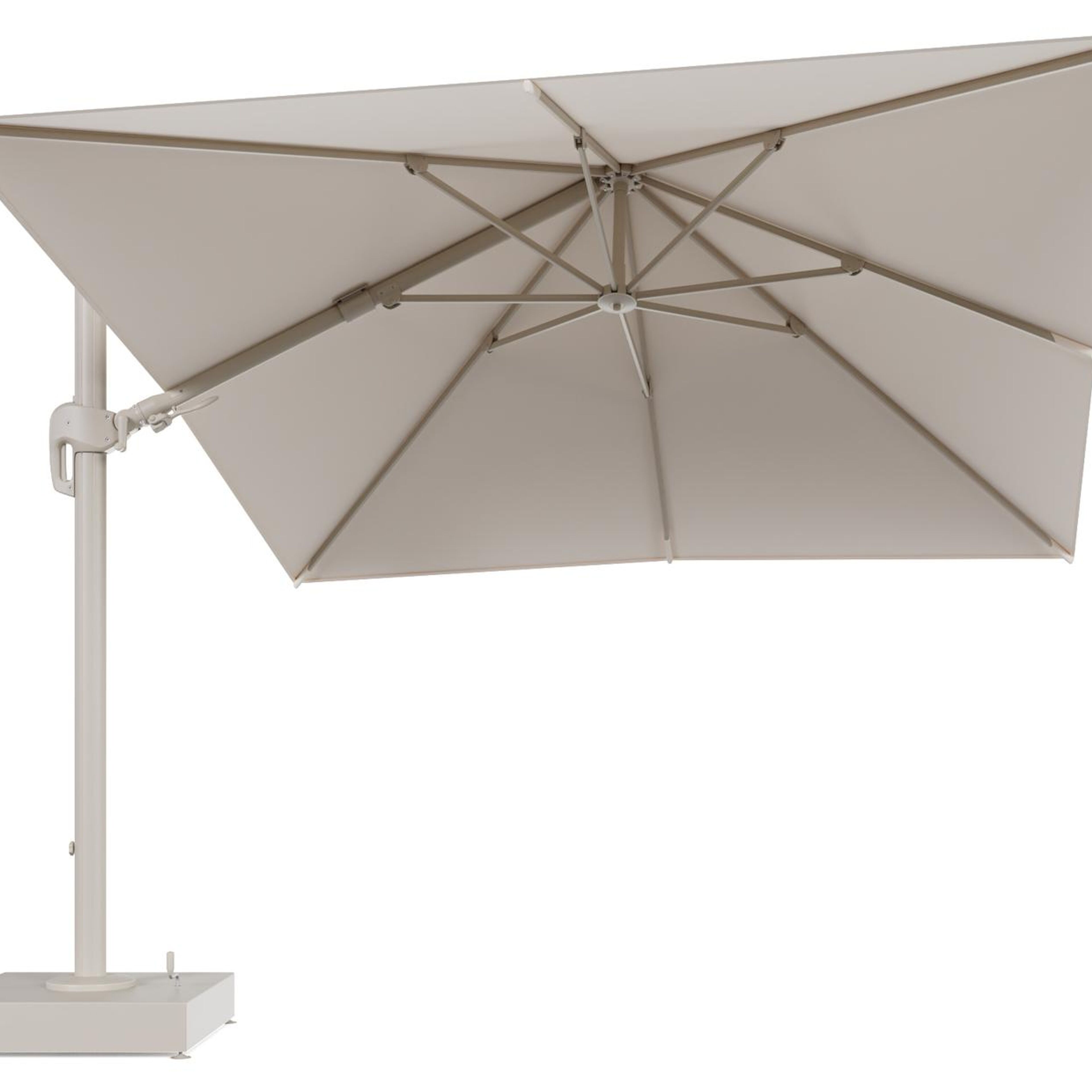 Rufina zweefparasol met tiltfunctie in beige aluminium en Natte Linen Chalk All Weather Sunbrella® Luxe parasoldoek - L1 300 x L2 300 cm met parasolvoet Minore 150 kg met wielen | Exterioo tuinmeubelen