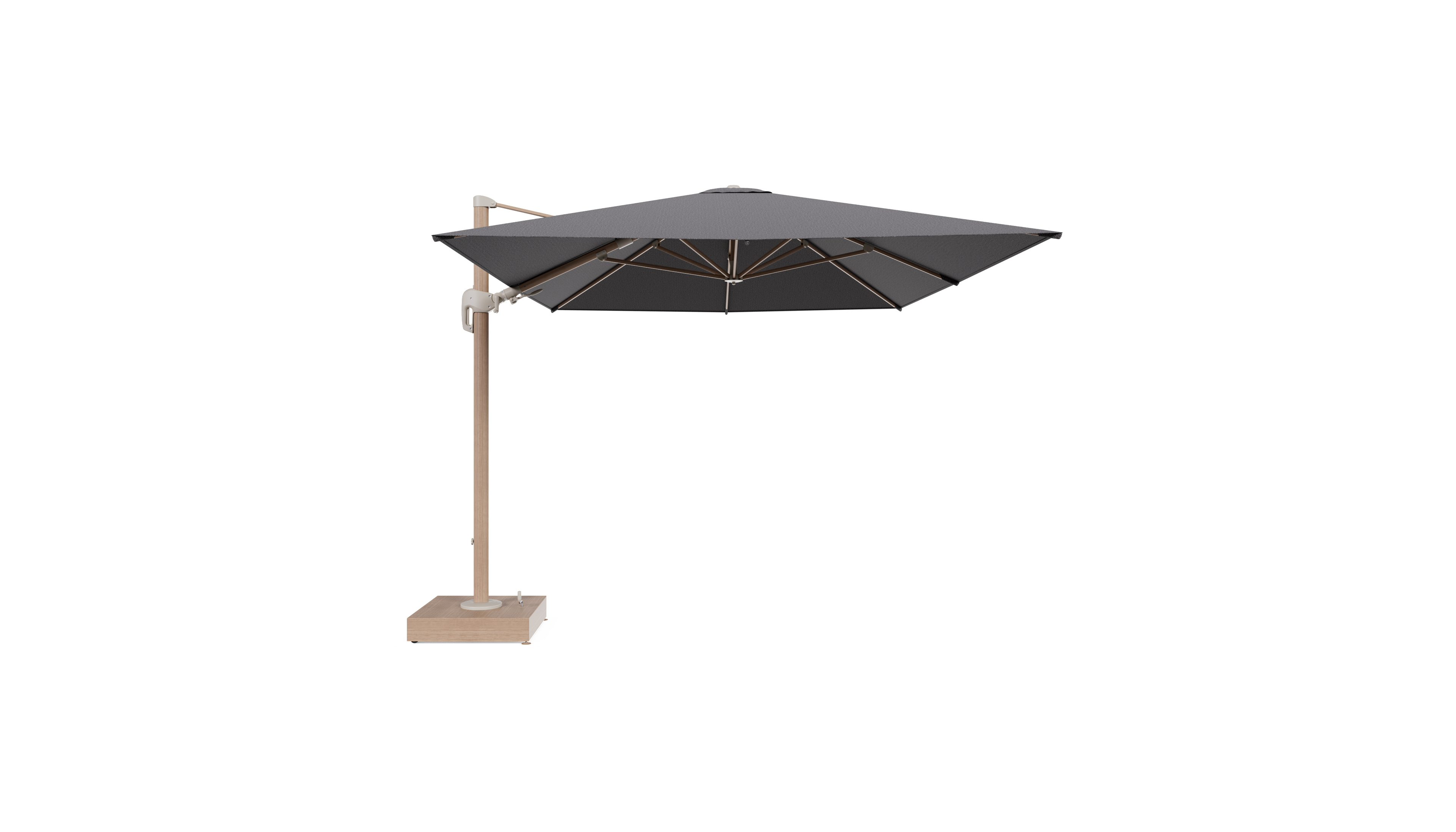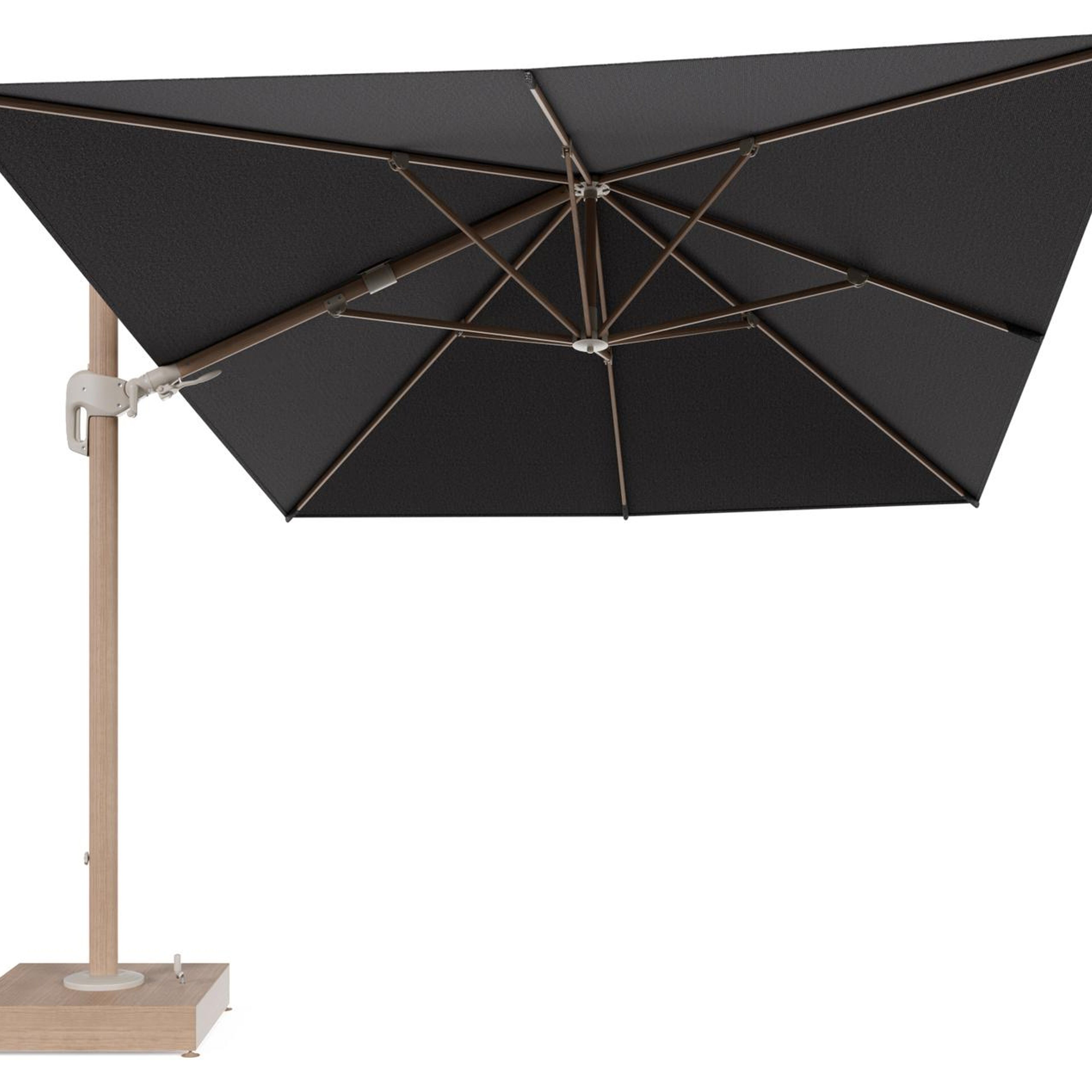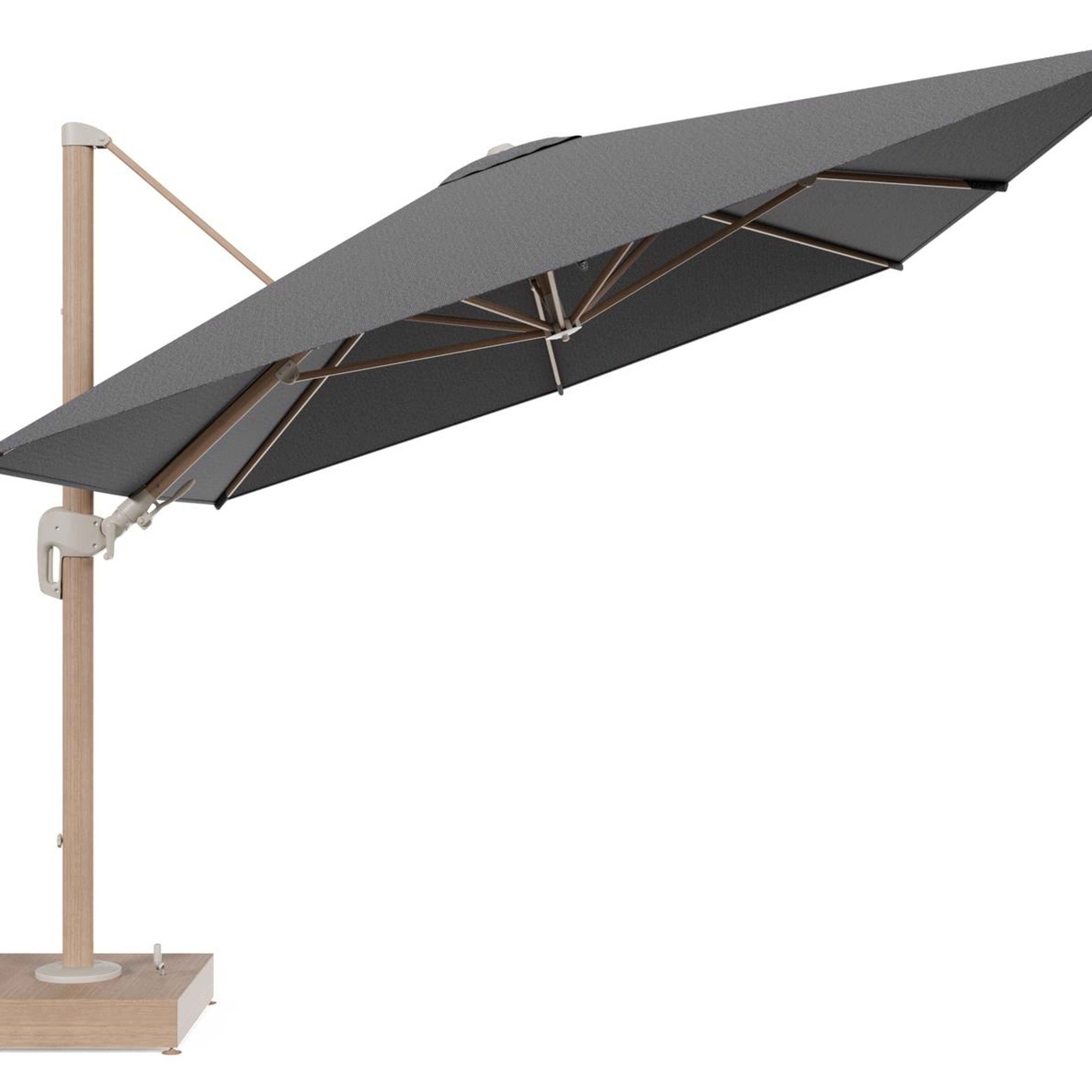 Rufina zweefparasol met tiltfunctie in houtlook aluminium en Firenze Tunder All Weather Solica parasoldoek - L1 400 x L2 300 cm met parasolvoet Minore 150 kg met wielen | Exterioo tuinmeubelen