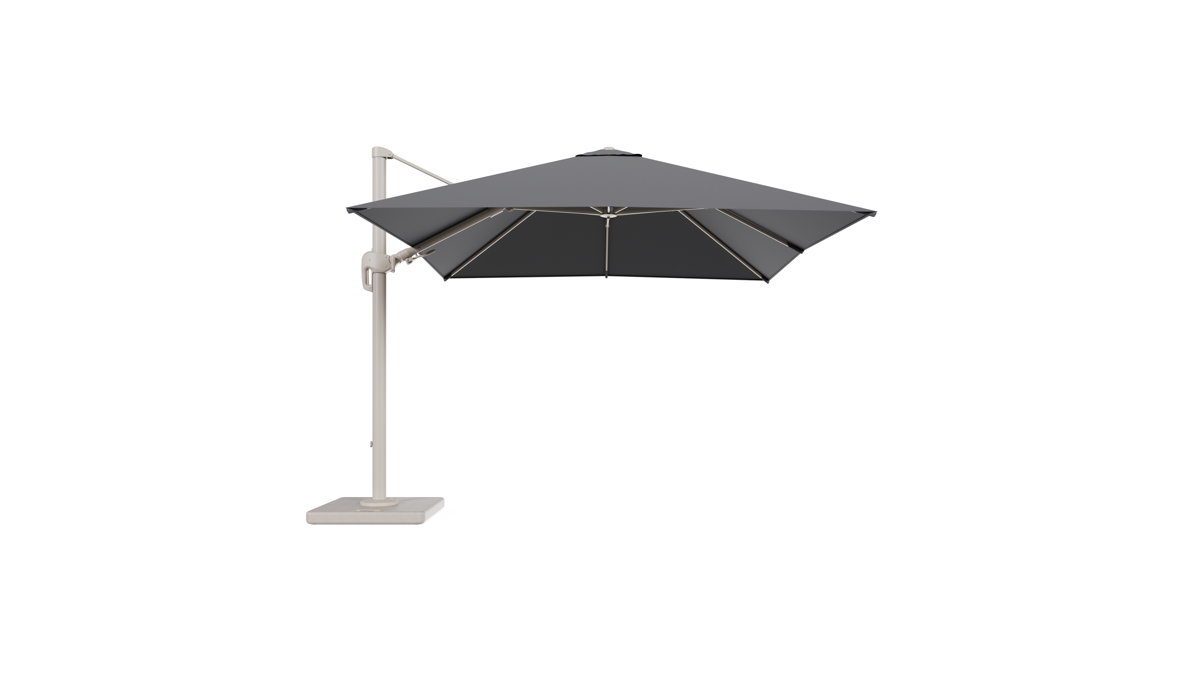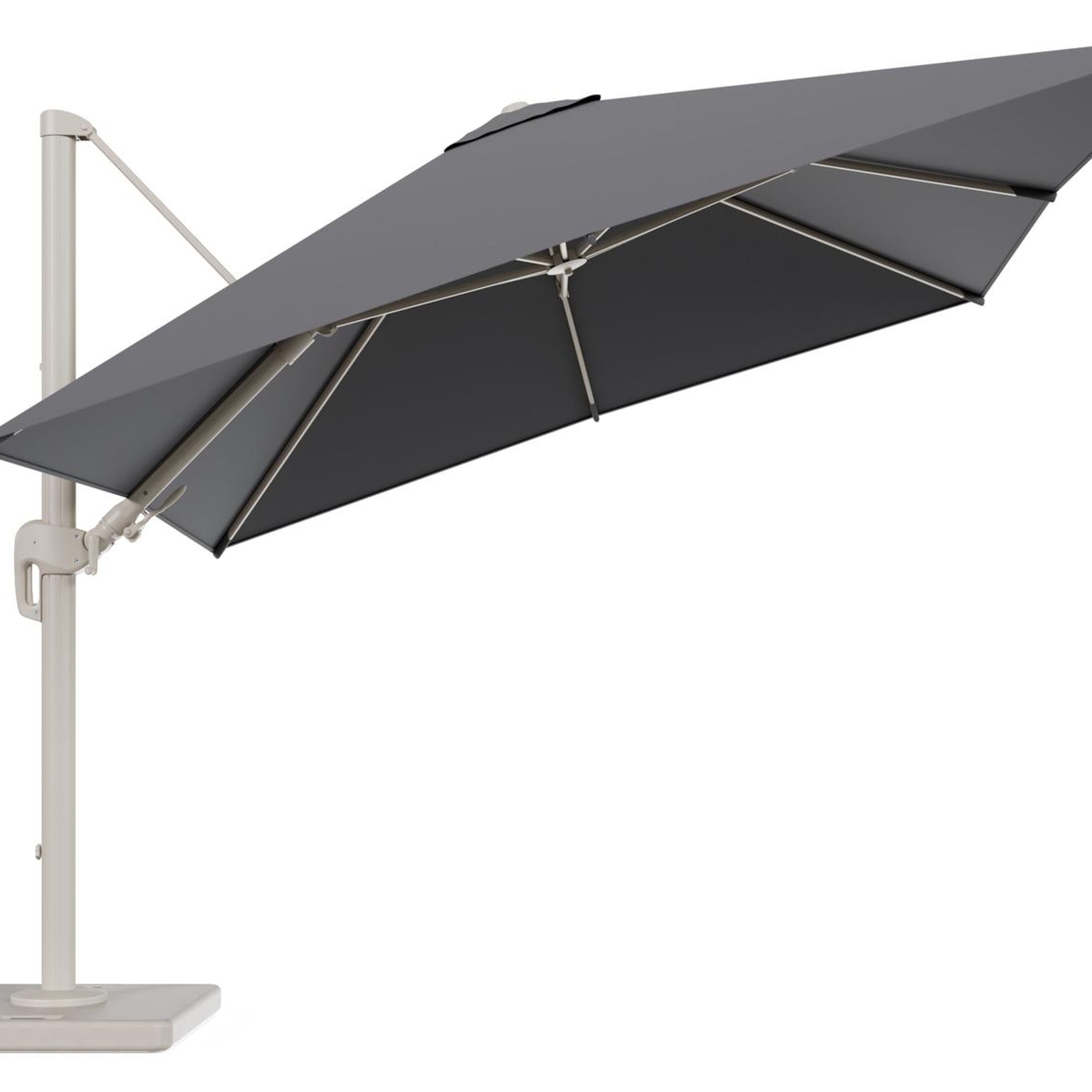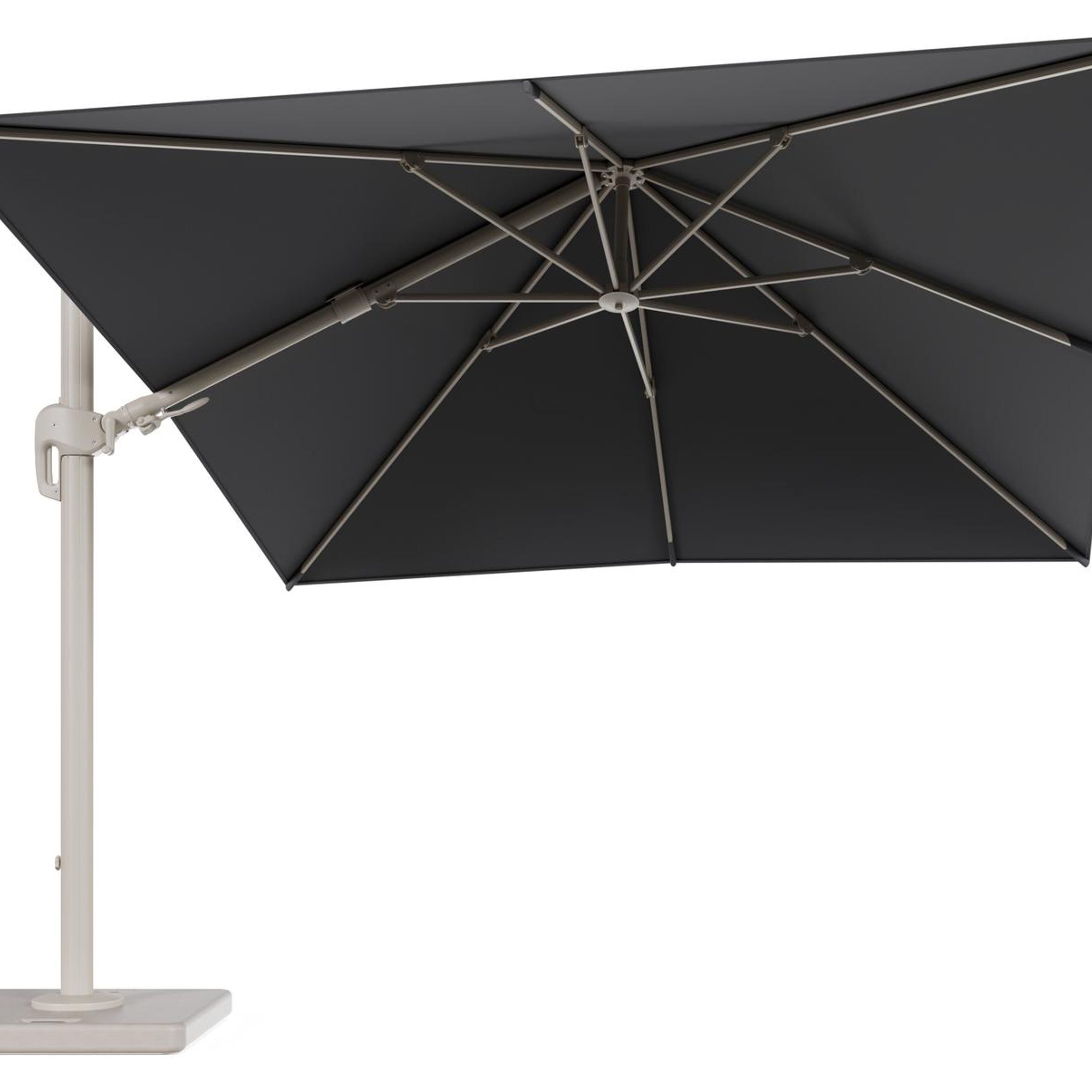 Rufina zweefparasol tiltfunctie in beige aluminium en parasoldoek in All Weather Sunbrella® Luxe Natte Charcoal Chine - L1 300 x L2 300 cm met parasolvoet Lapido 120 kg | Exterioo tuinmeubelen