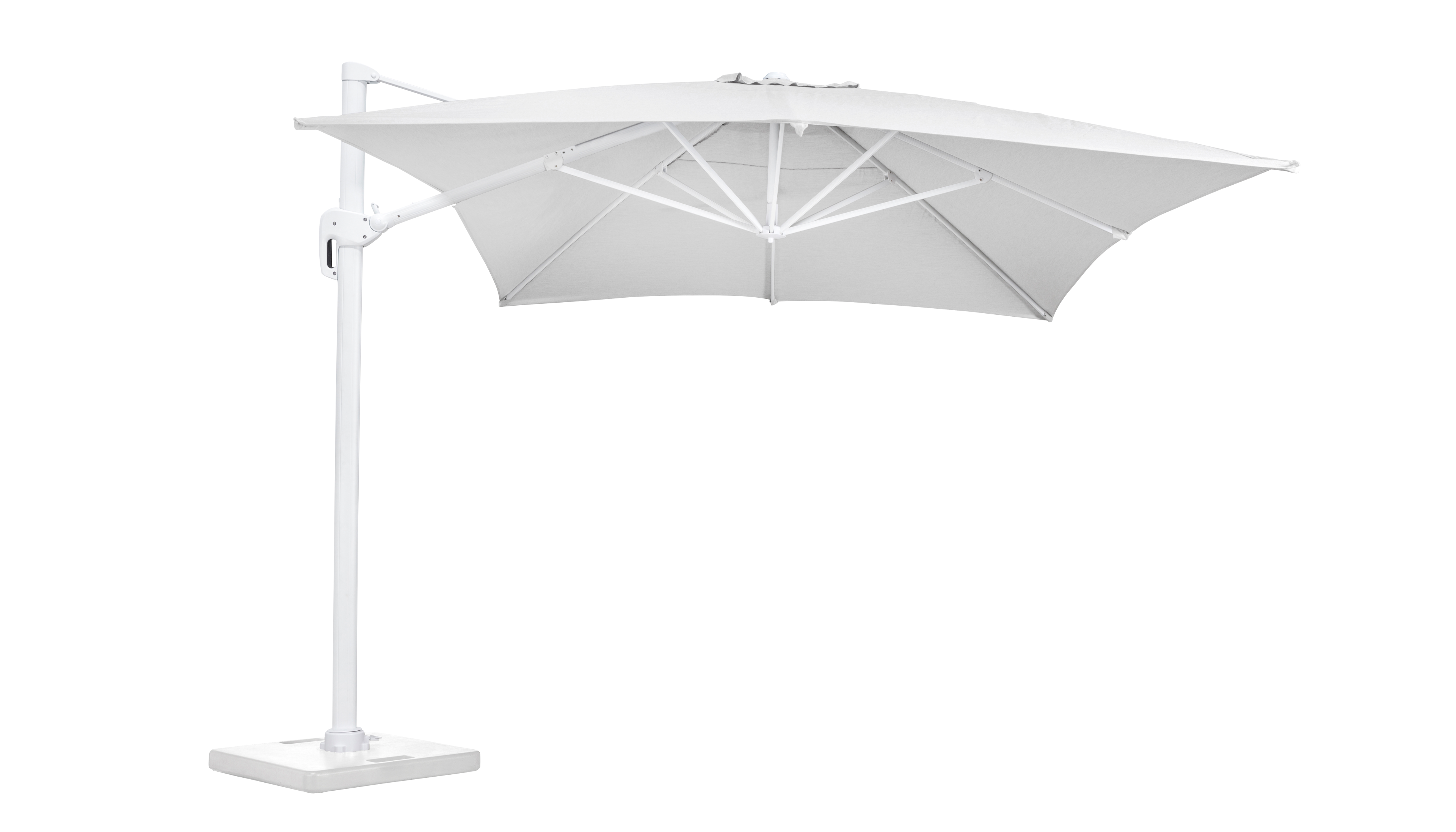 De Rufina zweefparasol geeft je schaduw in elke hoek van jouw terras. De parasol kan rond zijn as draaien en is in de hoogte verstelbaar. De parasolvoet uit beton en beschermhoes zijn inclusief.
