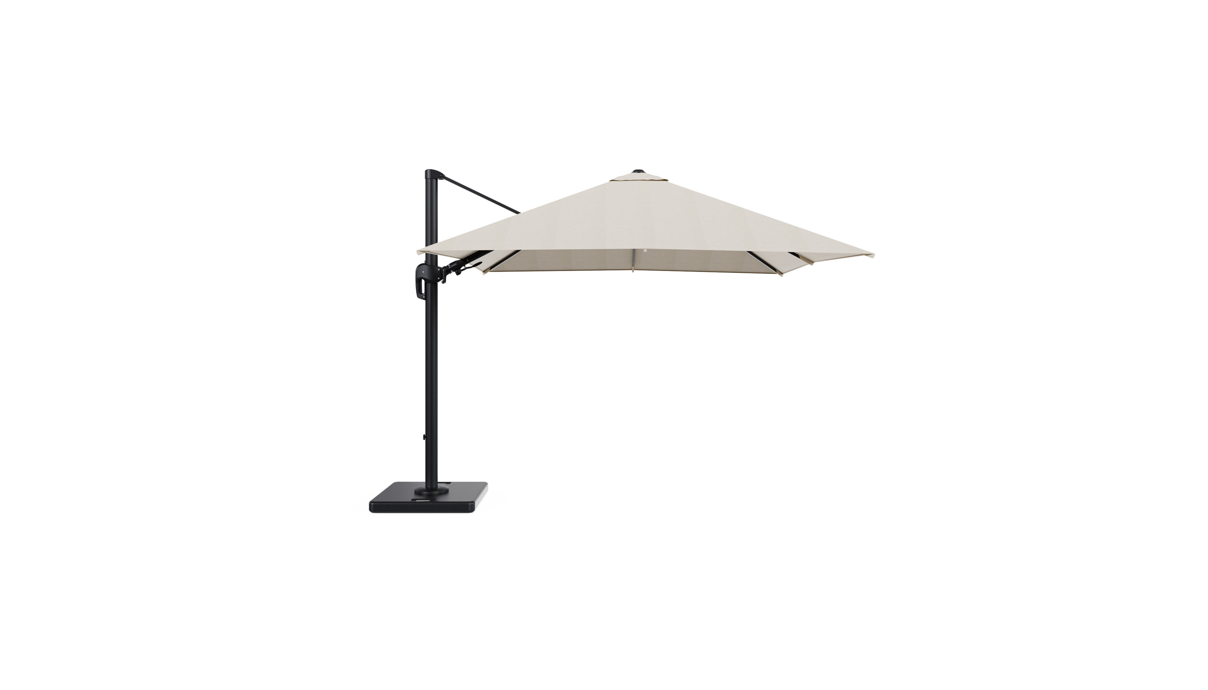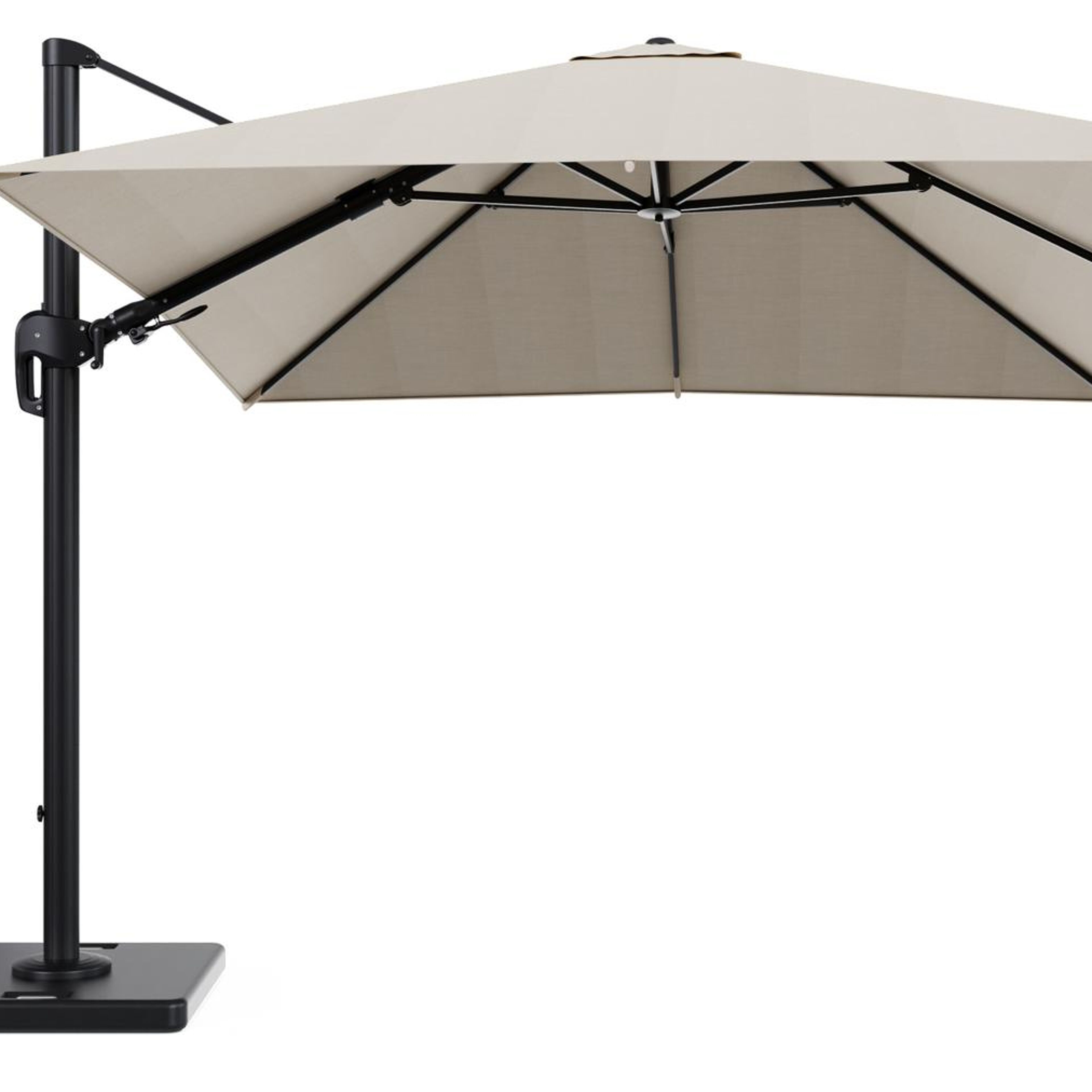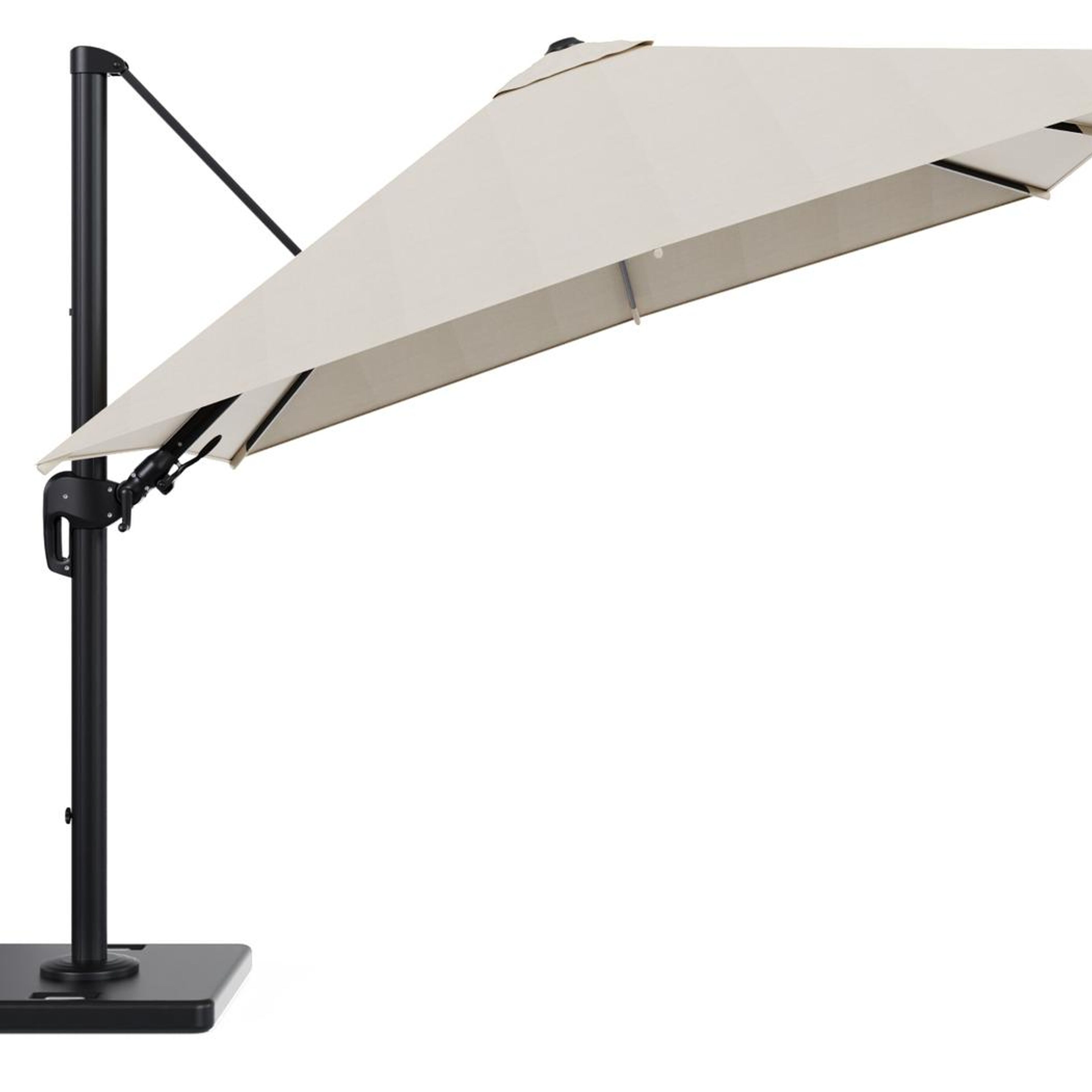 Rufina zweefparasol met tiltfunctie in zwart aluminium met beige all weather sunbrella® premium parasoldoek - L1 300 x L2 300 cm met parasolvoet Lapido 120 kg | Exterioo tuinmeubelen