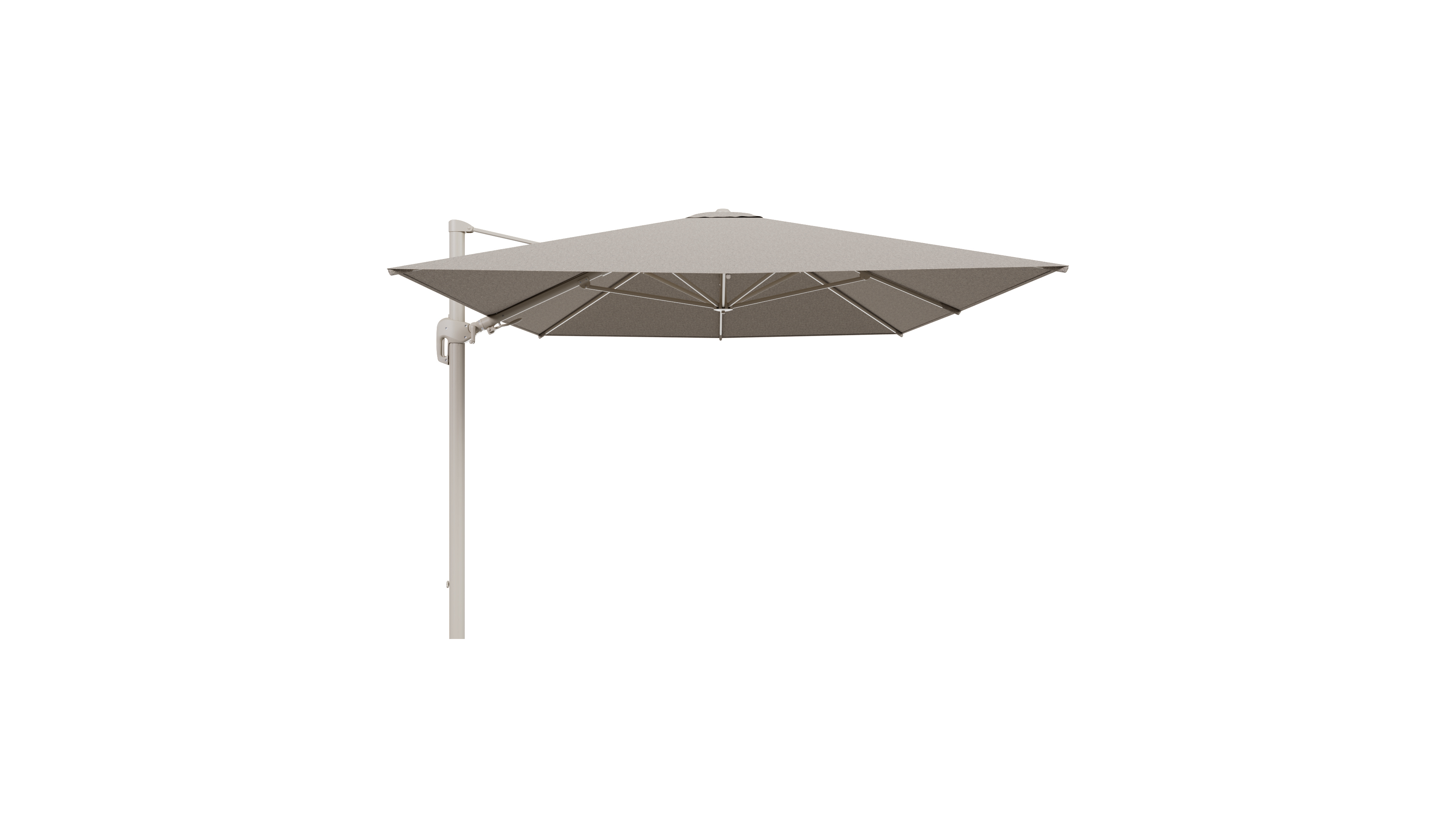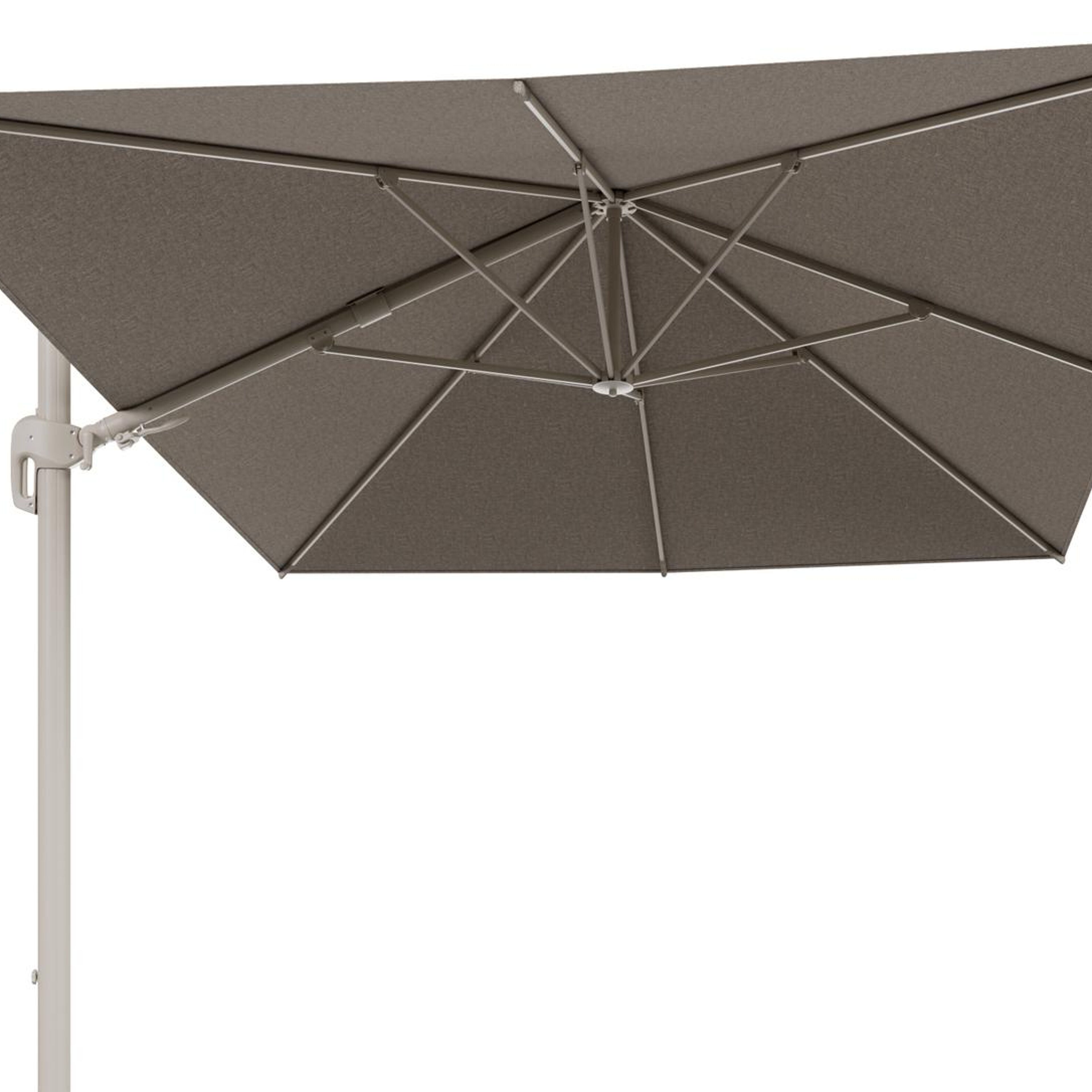 Het frame van de parasol is gemaakt uit roestvrij aluminium. Dit sterke en onderhoudsvriendelijke materiaal zorgt voor een stevige constructie en een moderne uitstraling.