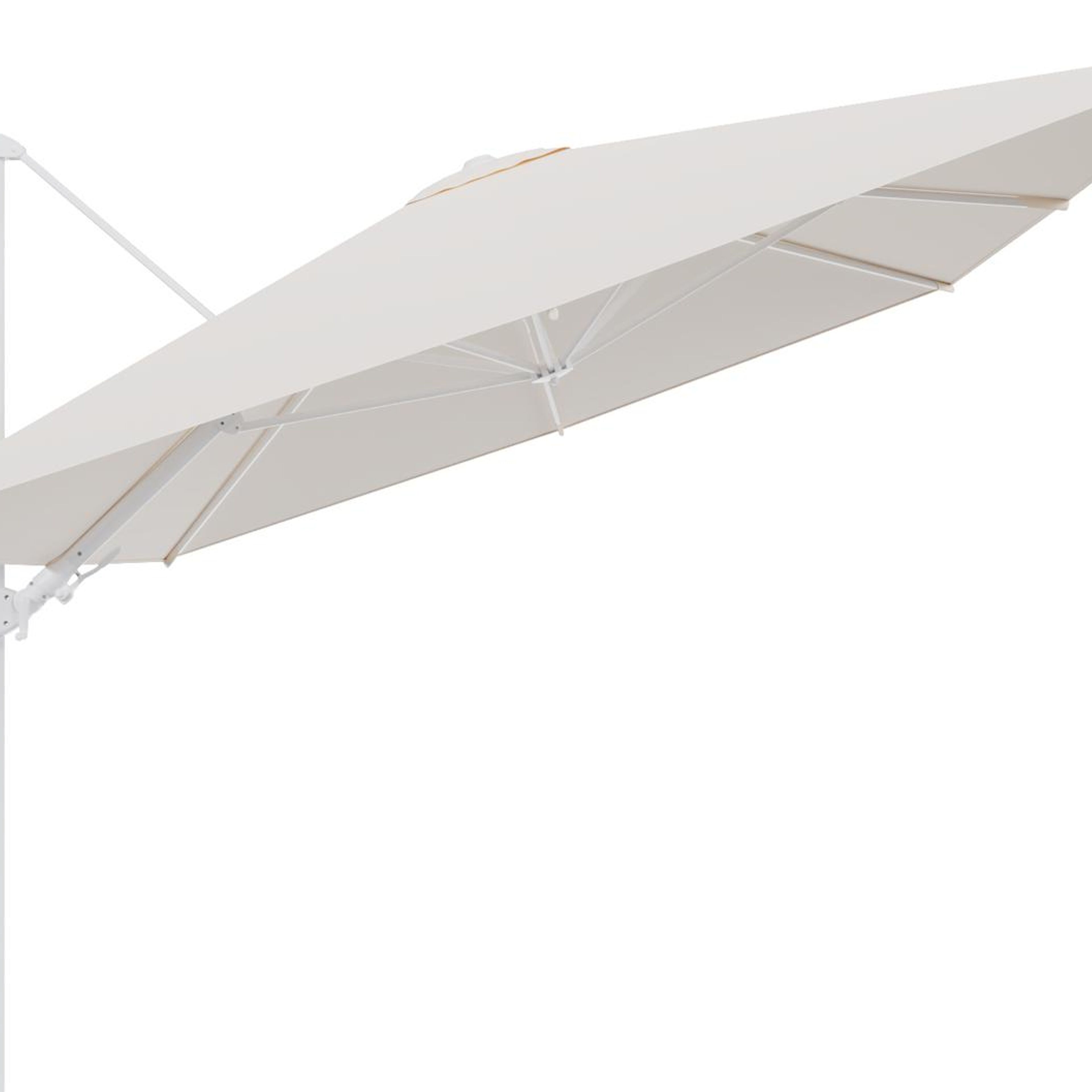 Het frame van de parasol is gemaakt uit roestvrij aluminium. Dit sterke en onderhoudsvriendelijke materiaal zorgt voor een stevige constructie en een moderne uitstraling.