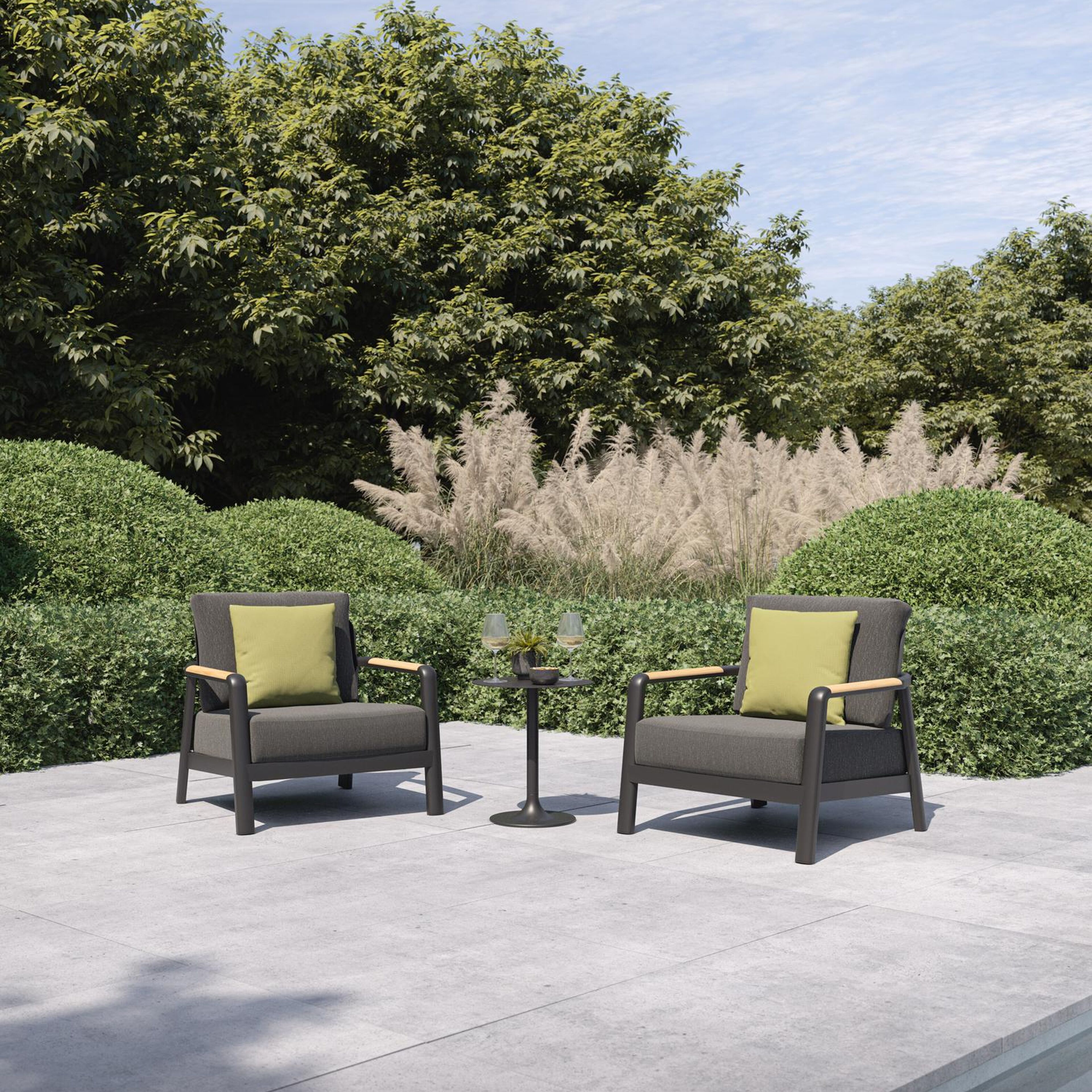 Het frame van de lounge is gemaakt uit roestvrij aluminium, een sterk, maar toch licht materiaal dat makkelijk verplaatsbaar is. Het oppervlak is glad afgewerkt waardoor het geen vuil aantrekt en onderhoudsvriendelijk is. De poedercoating zorgt voor de UV- en weersbestendigheid van je meubel. De armleuningen zijn afgewerkt in teak. Teak is een kwalitatieve houtsoort gekenmerkt door zijn hardheid.