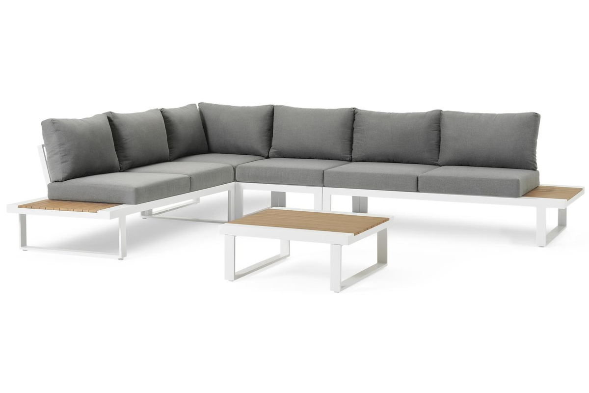 De loungetafel is inbegrepen in de loungeset en gemaakt uit een onderstel van roestvrij aluminium. De afwerking van het tafelblad bestaat uit polywood.