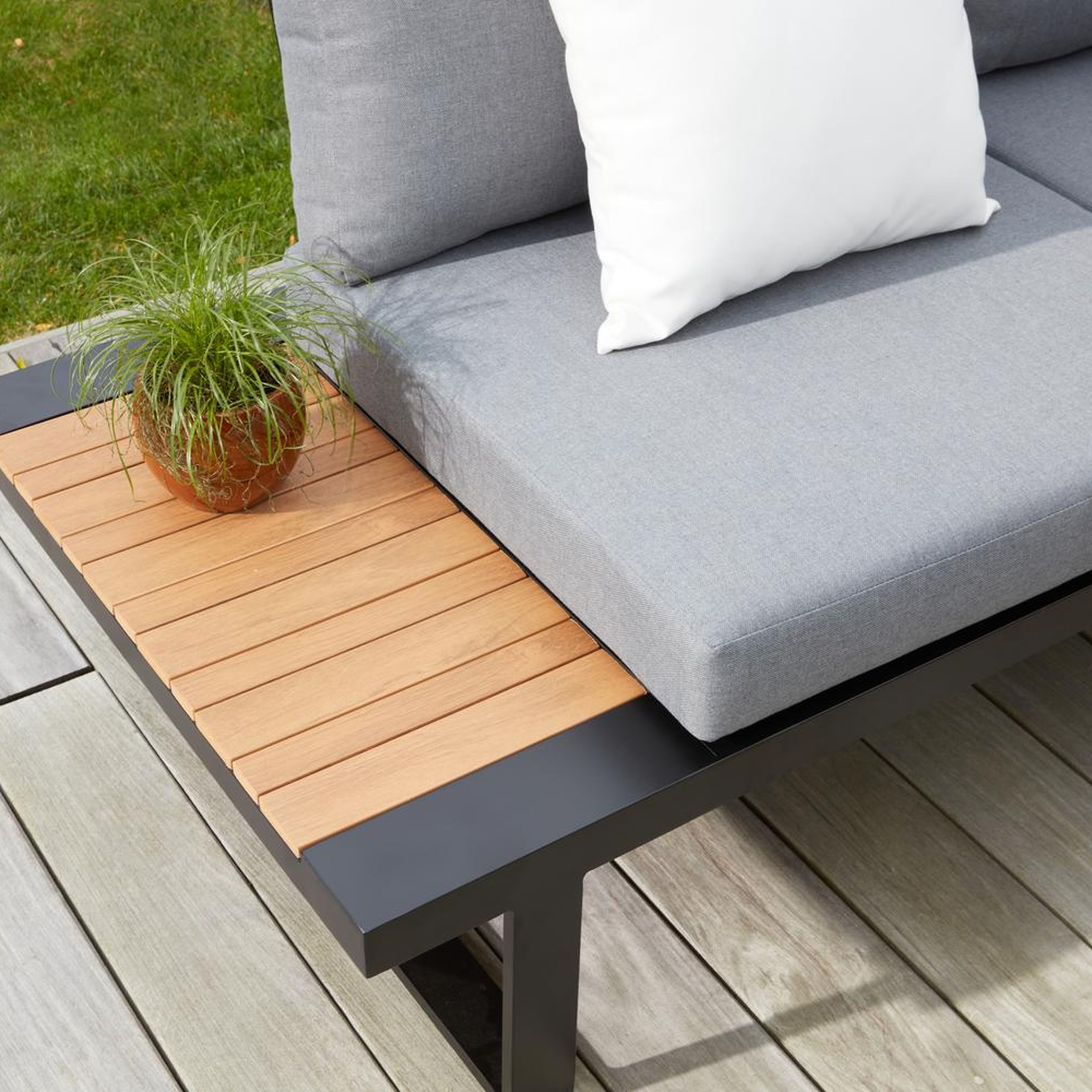 De loungekussens zijn inbegrepen in de loungeset en zijn gemaakt uit polyester: een zachte, synthetische stof. Polyester krimpt of kreukt nauwelijks en is een stevige stof. Je kan het kussen makkelijk wassen aangezien het kussen afritsbaar is. We raden je aan de kussens binnen te nemen bij regen of tijdens de wintermaanden. Een tussenstuk in een lounge biedt veel flexibiliteit in het vergroten van de lounge, spiegelen van de hoek en creëren van een extra 1-zit. Het biedt verschillende mogelijkheden voor het ontwerpen van de opstelling die past bij jouw behoeften en ruimte.