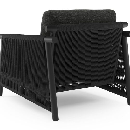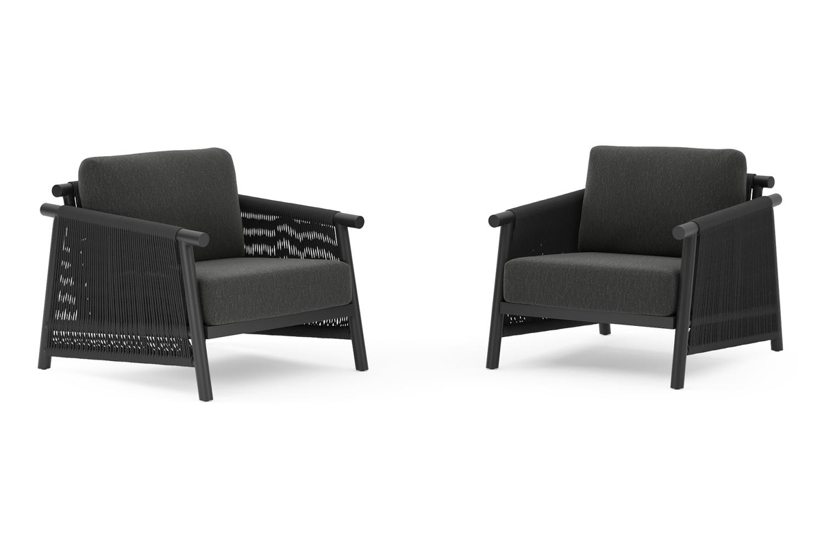 Set van 2 Erla loungestoelen in zwart aluminium en zwart verticaal geweven ronde rope met zwart weather+ softtouch kussens | Exterioo