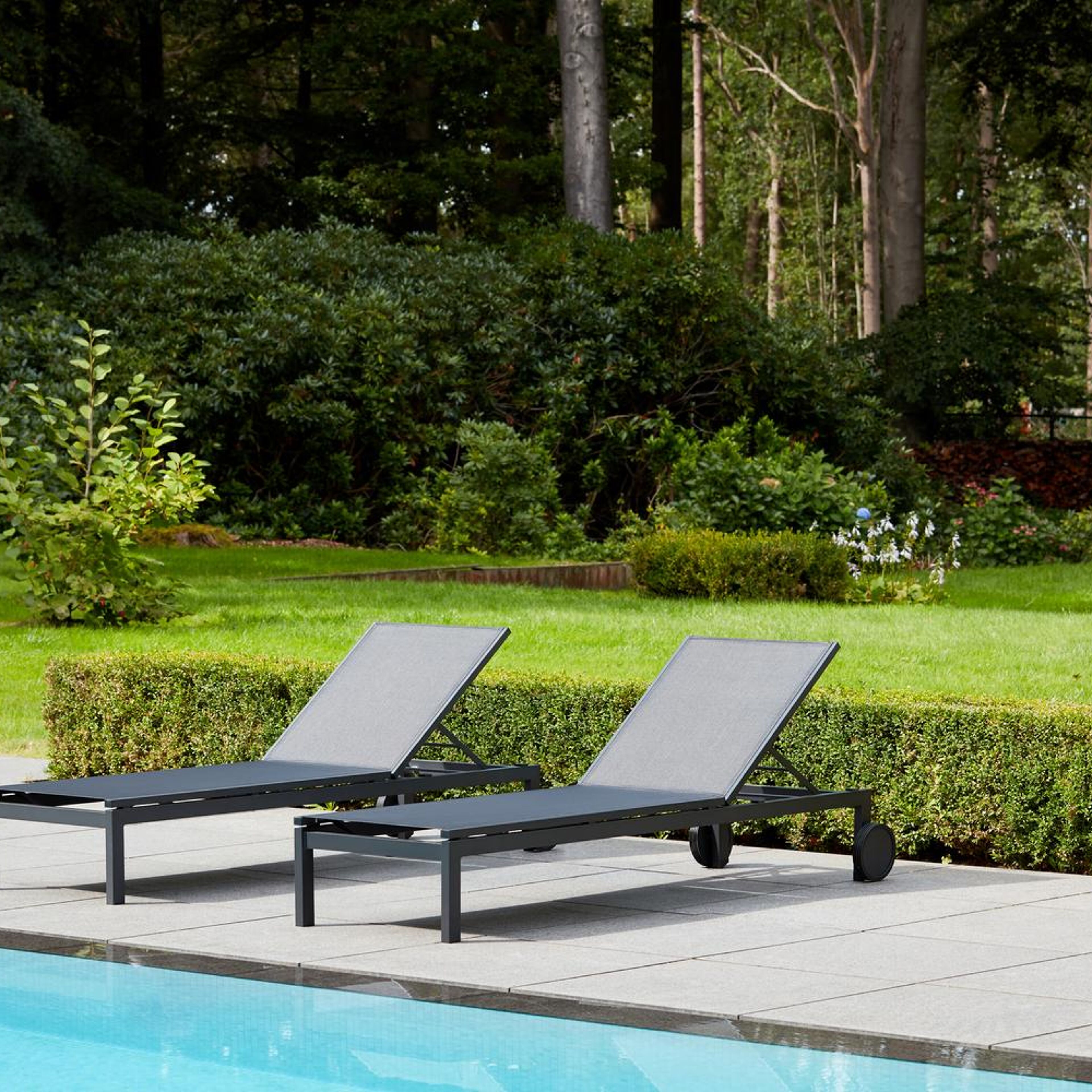 De set van 2 verstelbare Caravelle ligbedden is een strak en robuust ligbed door de look van het frame. De rugleuning is verstelbaar in 5 standen. Je kan het ligbed ook makkelijk verplaatsen dankzij de grote wielen achteraan.