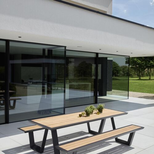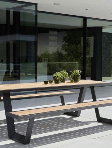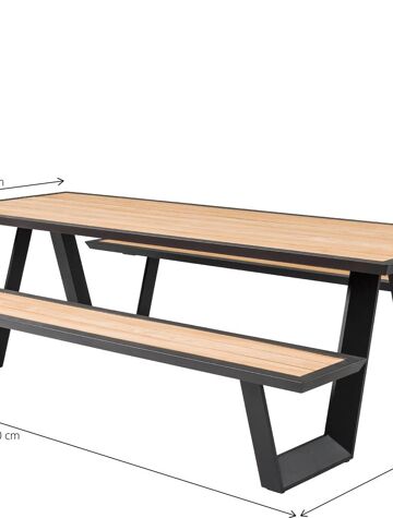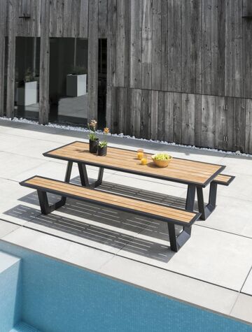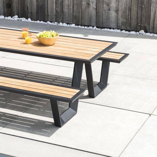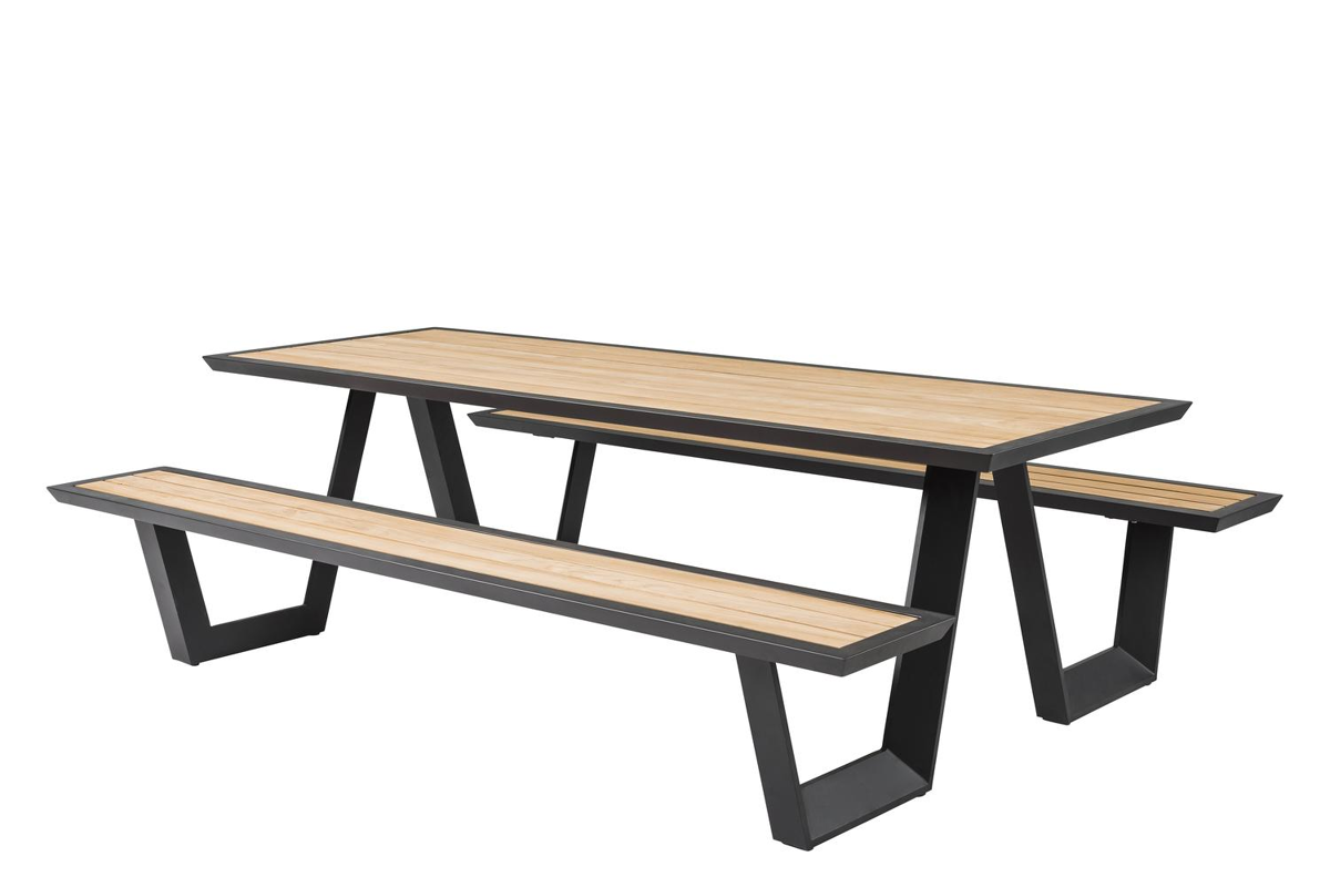 Sevilla picknicktafel in zwart aluminium en teak tafelblad - L 240 x B 175 x H 71 cm | Exterioo