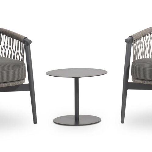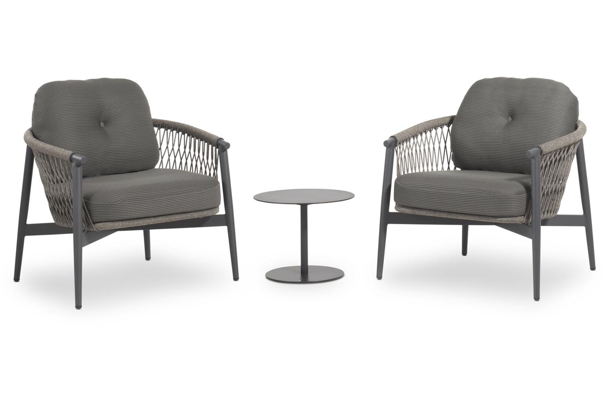 Complete lounge balkonset met 2x lounge zeteltje met zwart aluminium onderstel afgewerkt met donkergrijze polyrope. Inclusief sunproof en kleurvast zit- en rugkussen van polypropyleen. Totale afmeting: B 76 x D 77 x H 67cm. Inclusief ronde bijzettafel in zwart aluminium. Diam. 44 x H 34 cm.