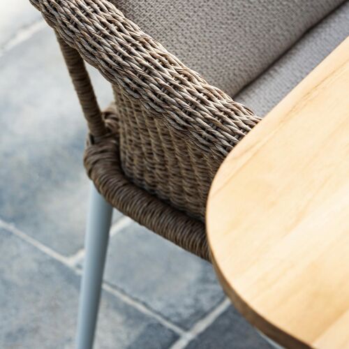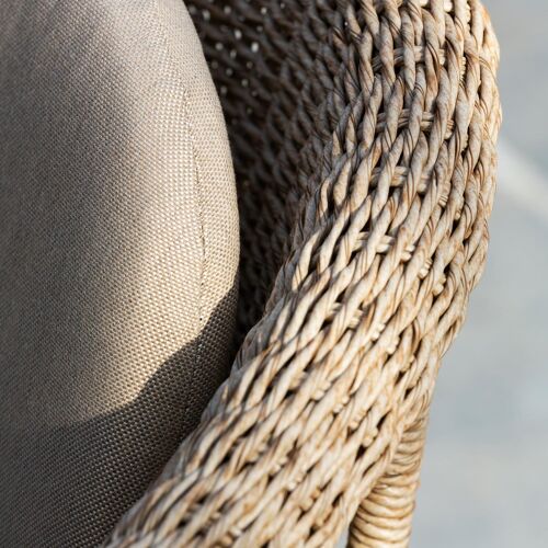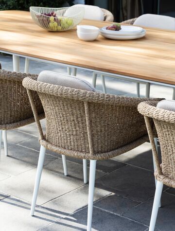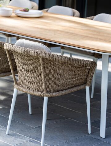 Stapelbare tuinstoel met frame in aluminium (wit), afgewerkt met 7 mm wicker (natural). Afmetingen: B 65 x D 62 x H 77 cm. Kussen niet inbegrepen.