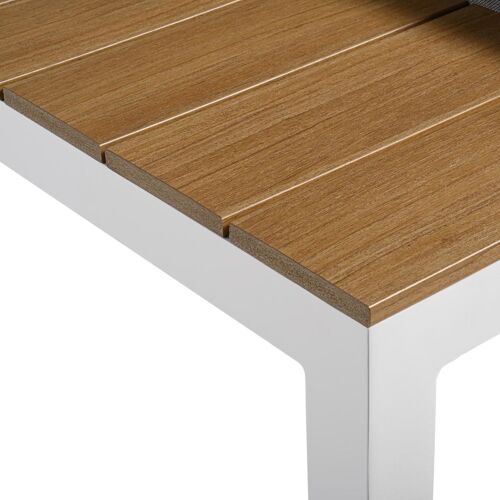 De loungetafel is inbegrepen in de loungeset en gemaakt uit een onderstel van roestvrij aluminium. De afwerking van het tafelblad bestaat uit polywood.