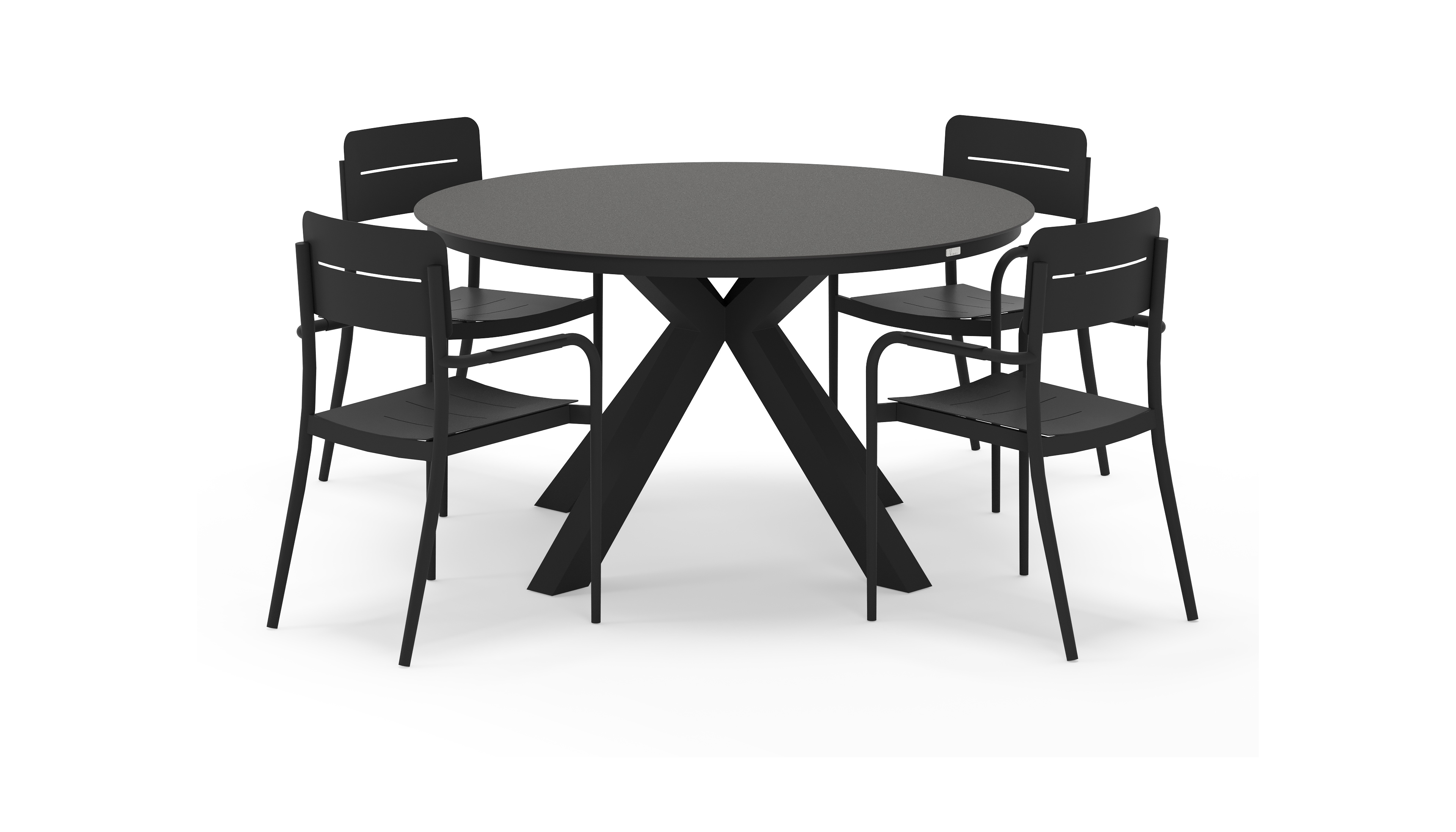 De Tora tuintafel is een collectie met ronde tafels. De kenmerkende kruispoot splitst zich onder het frame uit in vier gespreide poten, wat zorgt voor extra stabiliteit.