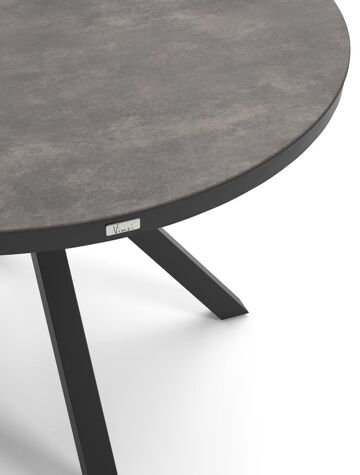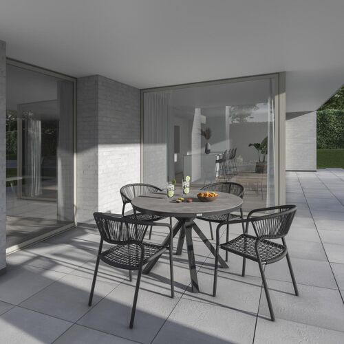 Tora tuinset is een collectie met ronde tafels. De kenmerkende kruispoot splitst zich onder het frame uit in vier gespreide poten, wat zorgt voor extra stabiliteit. Het frame van de tafel is gemaakt uit roestvrij aluminium, een sterk, maar toch licht materiaal dat makkelijk verplaatsbaar is. Het oppervlak is glad afgewerkt waardoor het geen vuil aantrekt en onderhoudsvriendelijk is. De poedercoating zorgt voor de UV- en weerbestendigheid van je meubel.