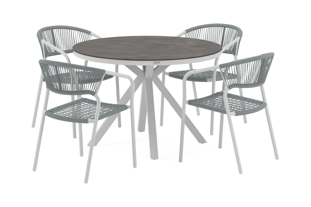 Tora tuinset is een collectie met ronde tafels. De kenmerkende kruispoot splitst zich onder het frame uit in vier gespreide poten, wat zorgt voor extra stabiliteit. Het frame van de tafel is gemaakt uit roestvrij aluminium, een sterk, maar toch licht materiaal dat makkelijk verplaatsbaar is. Het oppervlak is glad afgewerkt waardoor het geen vuil aantrekt en onderhoudsvriendelijk is. De poedercoating zorgt voor de UV- en weerbestendigheid van je meubel.