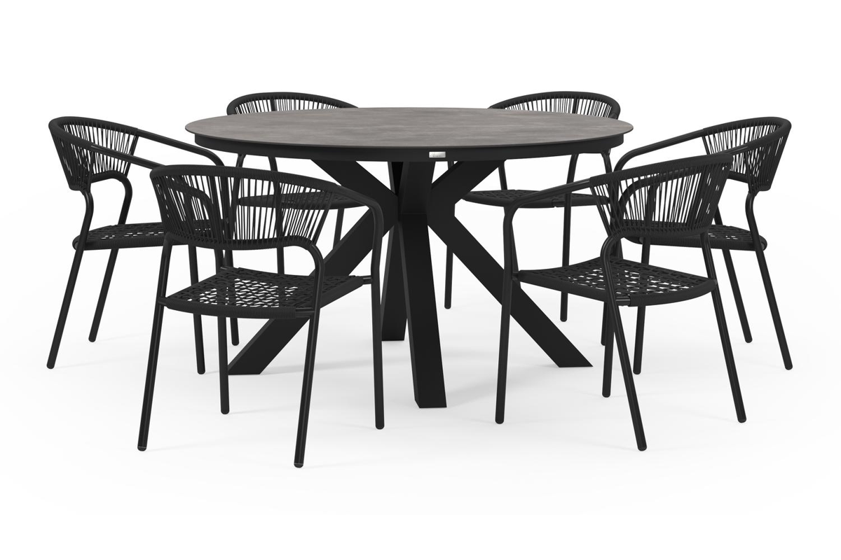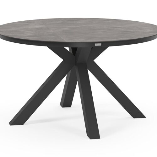 Tora tuinset is een collectie met ronde tafels. De kenmerkende kruispoot splitst zich onder het frame uit in vier gespreide poten, wat zorgt voor extra stabiliteit.