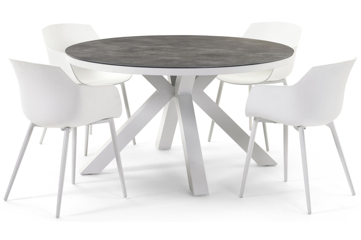 Tora tuinset is een collectie met ronde tafels. De kenmerkende kruispoot splitst zich onder het frame uit in vier gespreide poten, wat zorgt voor extra stabiliteit.
