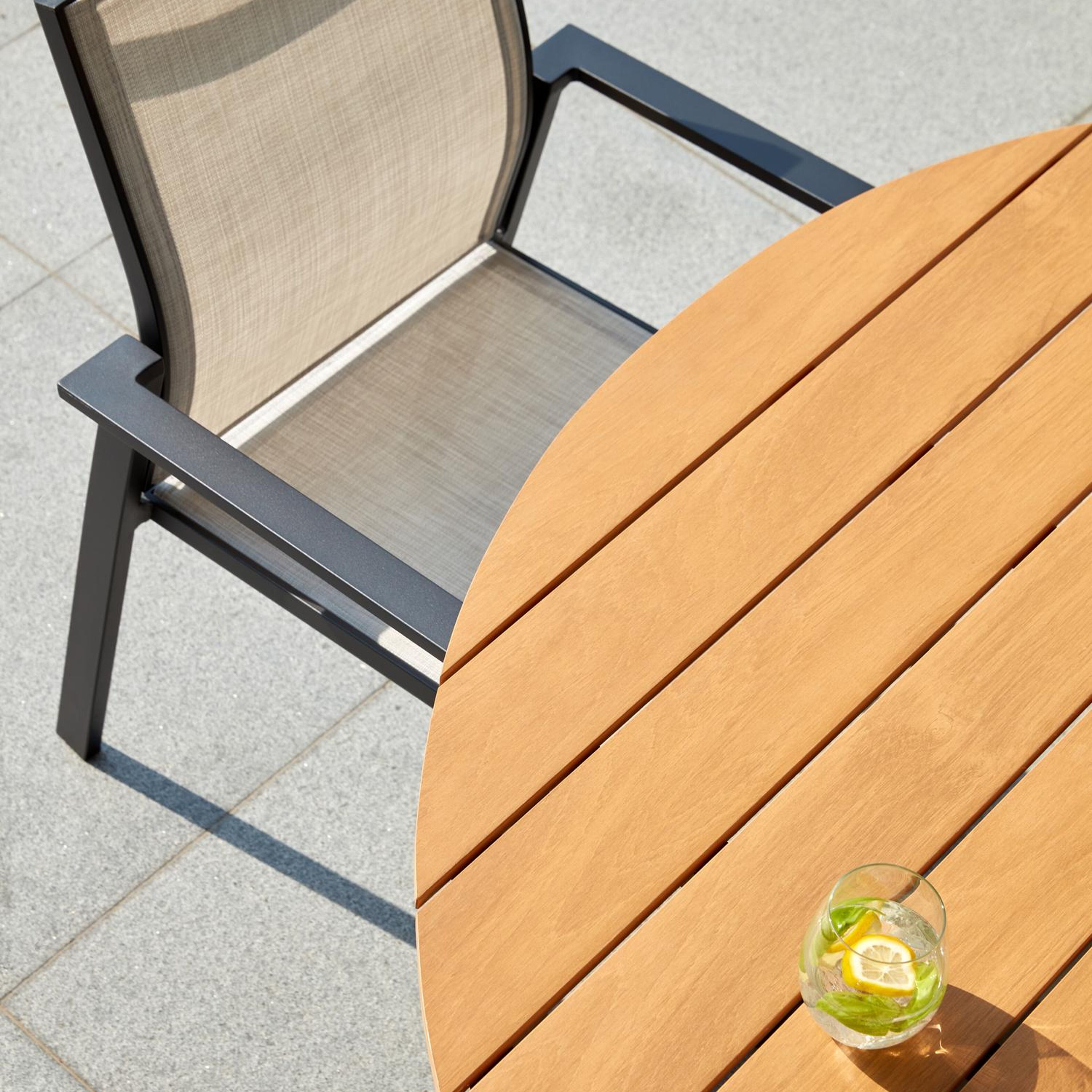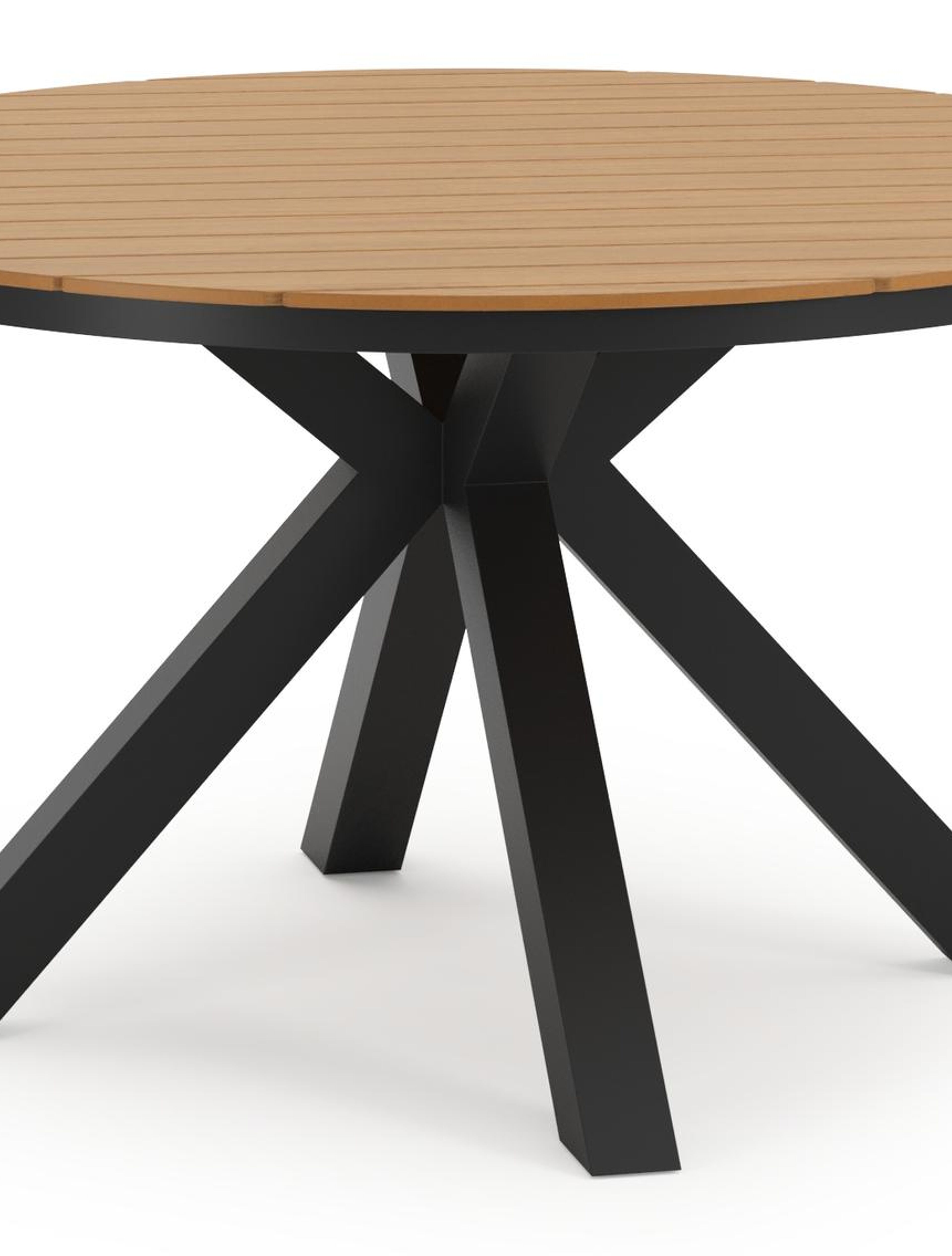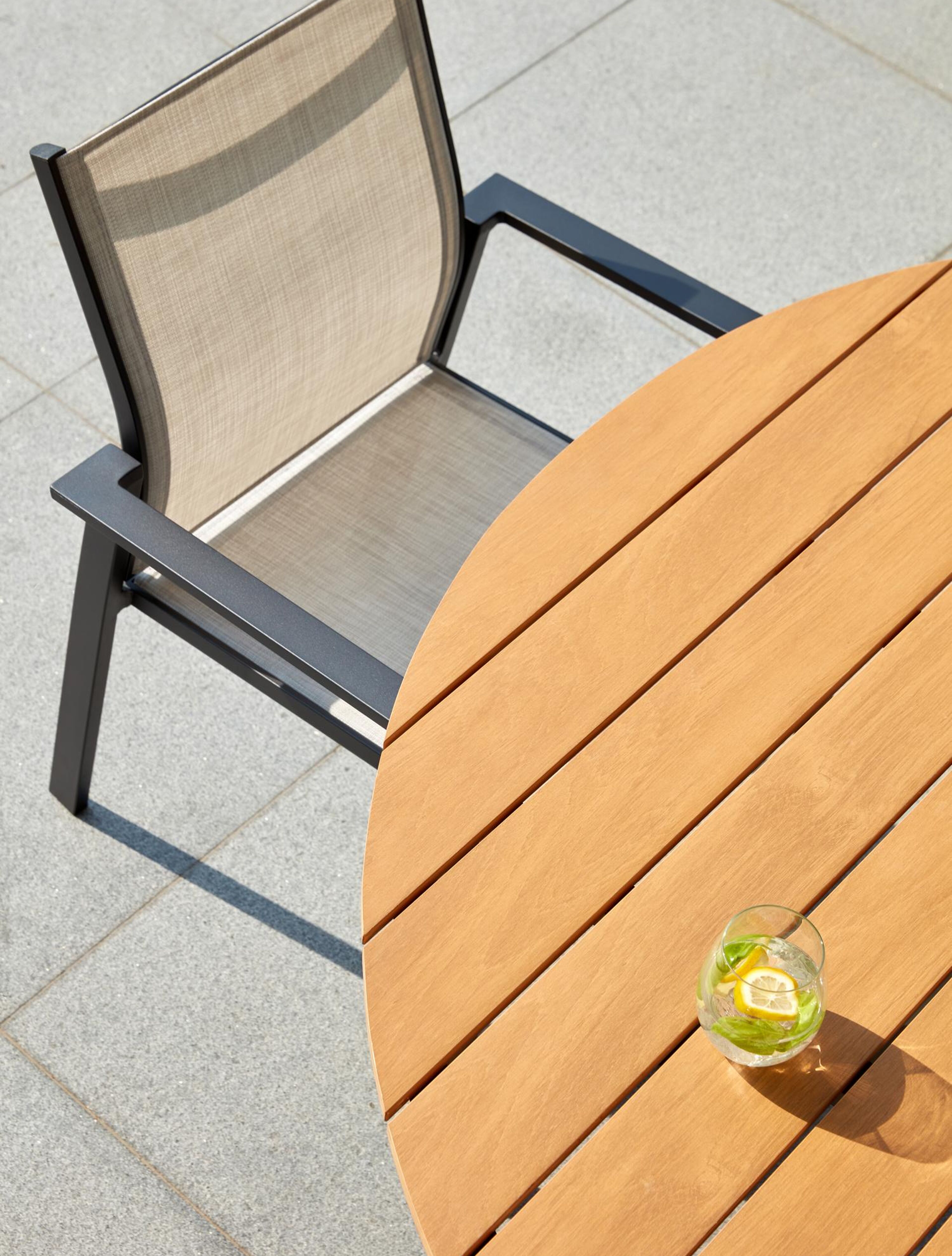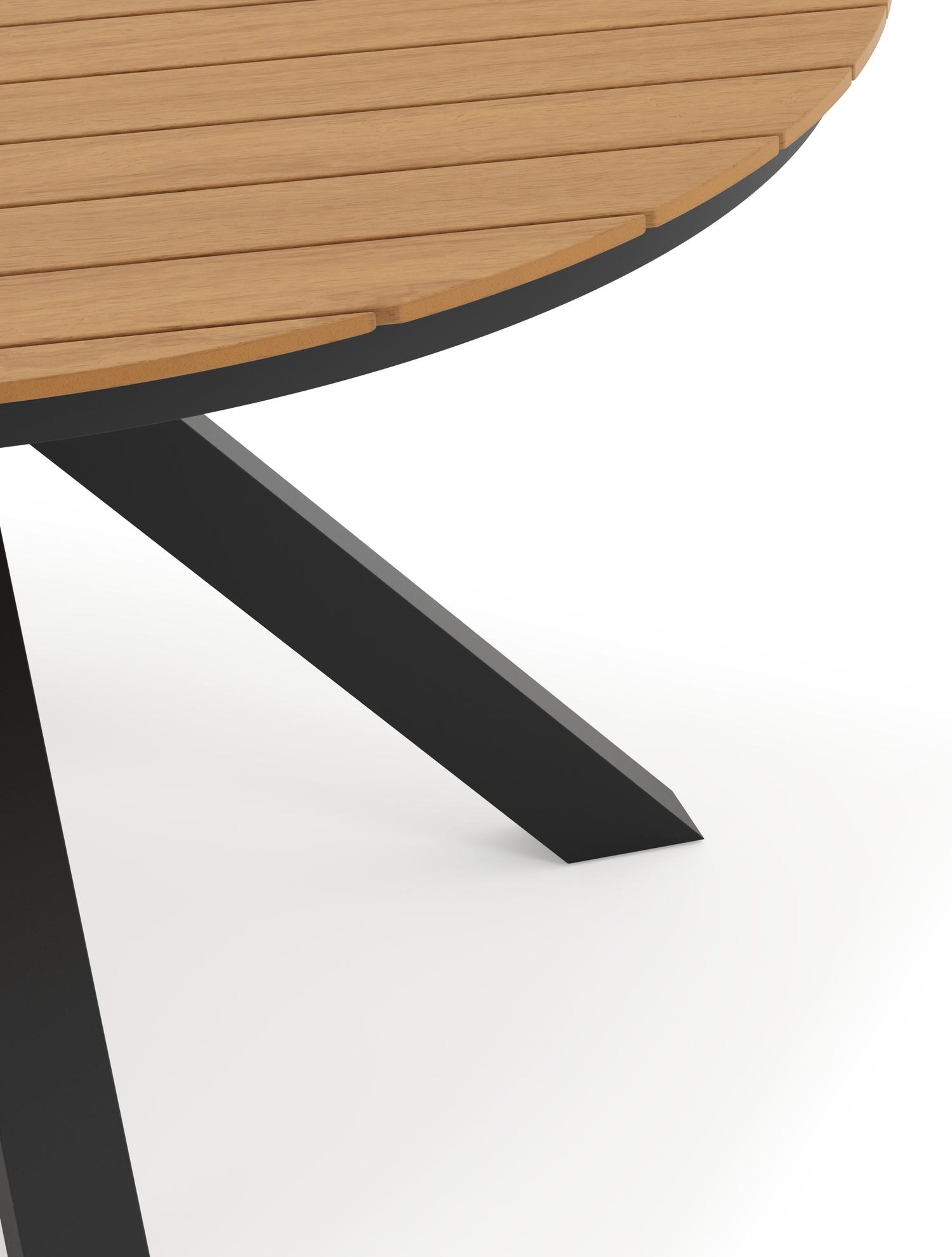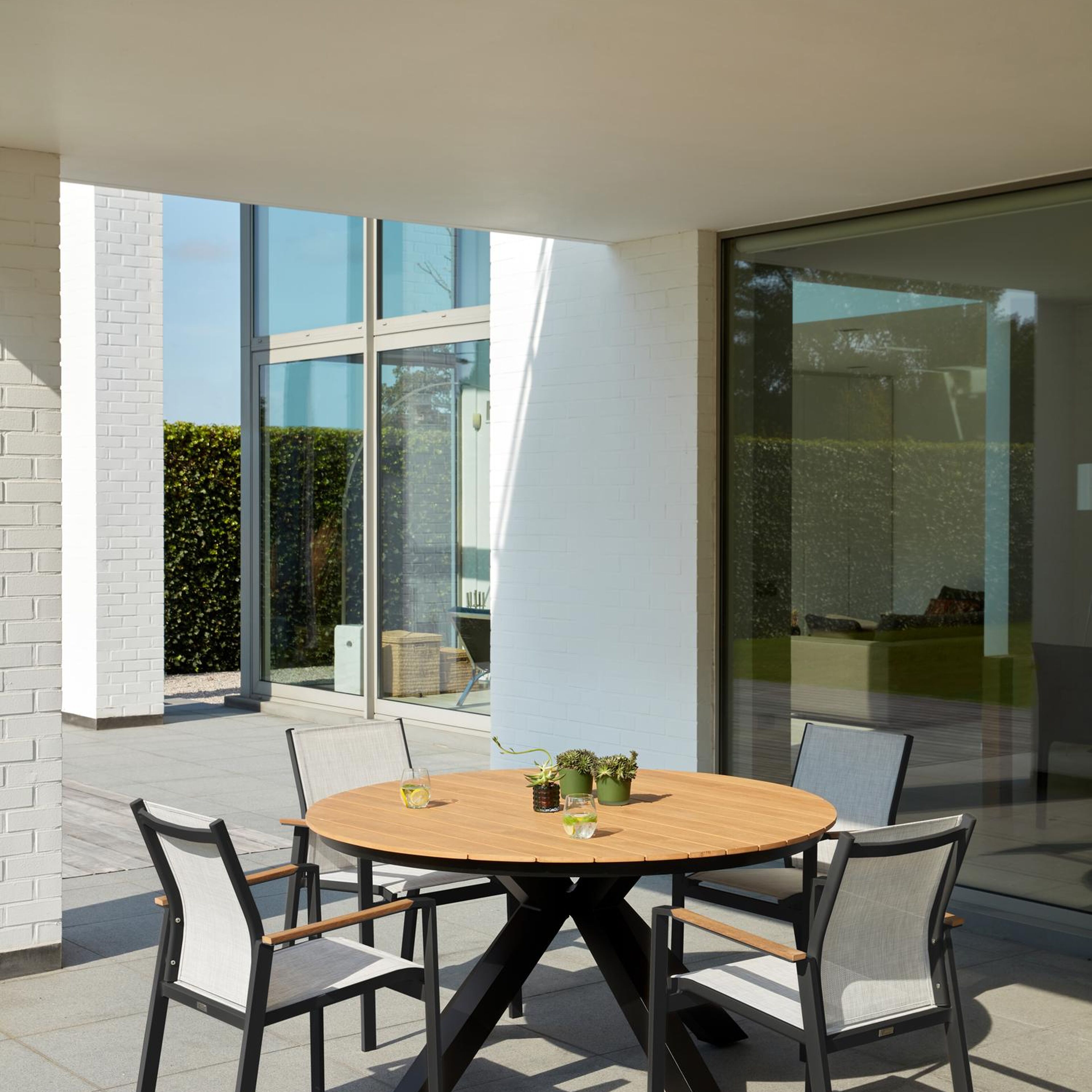 Tora tuinset is een collectie met ronde tafels. De kenmerkende kruispoot splitst zich onder het frame uit in vier gespreide poten, wat zorgt voor extra stabiliteit.