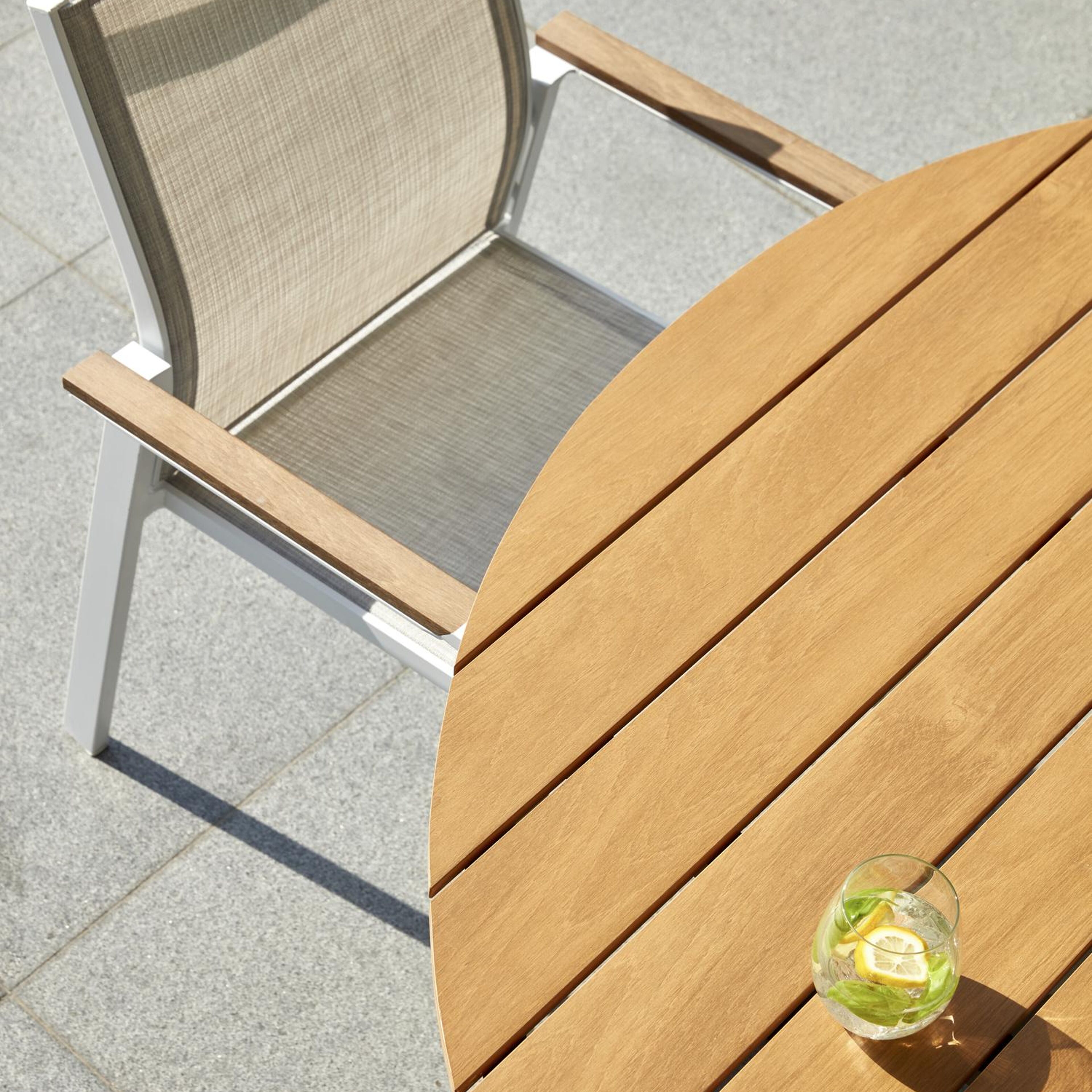 Het frame van de tafel is gemaakt uit roestvrij aluminium, een sterk, maar toch licht materiaal dat makkelijk verplaatsbaar is. Het oppervlak is glad afgewerkt waardoor het geen vuil aantrekt en onderhoudsvriendelijk is. De poedercoating zorgt voor de UV- en weerbestendigheid van je meubel.