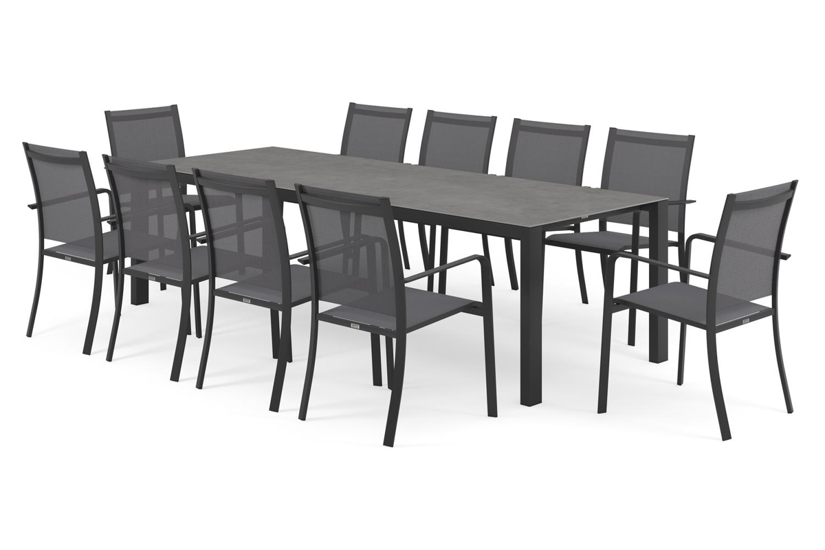 Trente tuinset in zwart aluminium en grijs volkeramiek tafelblad met 10 stapelbare Calobra tuinstoelen | Exterioo
