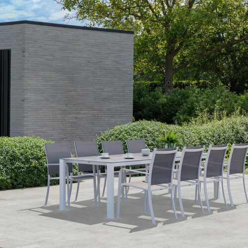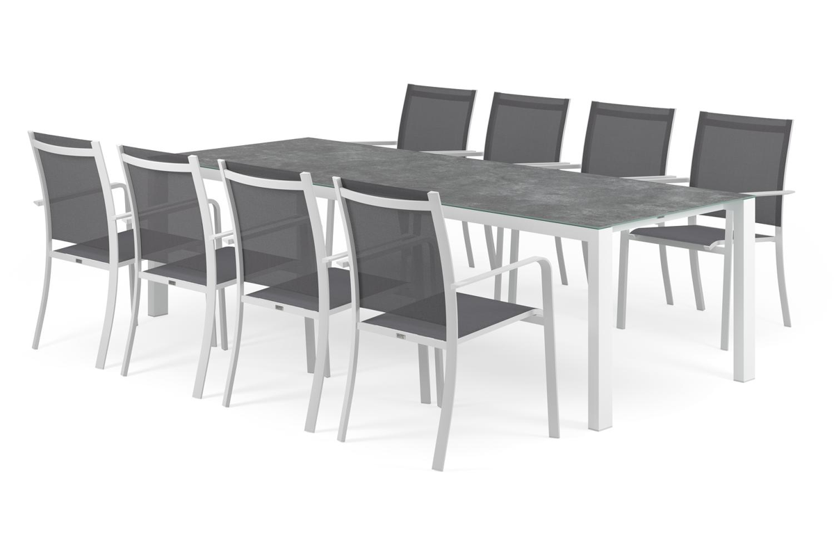 Trente tuinset heeft een stijvol design met een frame dat je tafelblad als het ware laat zweven. Dankzij de diepere ligging van de poten kan je op de kopse kant telkens nog een stoel plaatsen. De stevige tafelpoten maken deze tafel af.