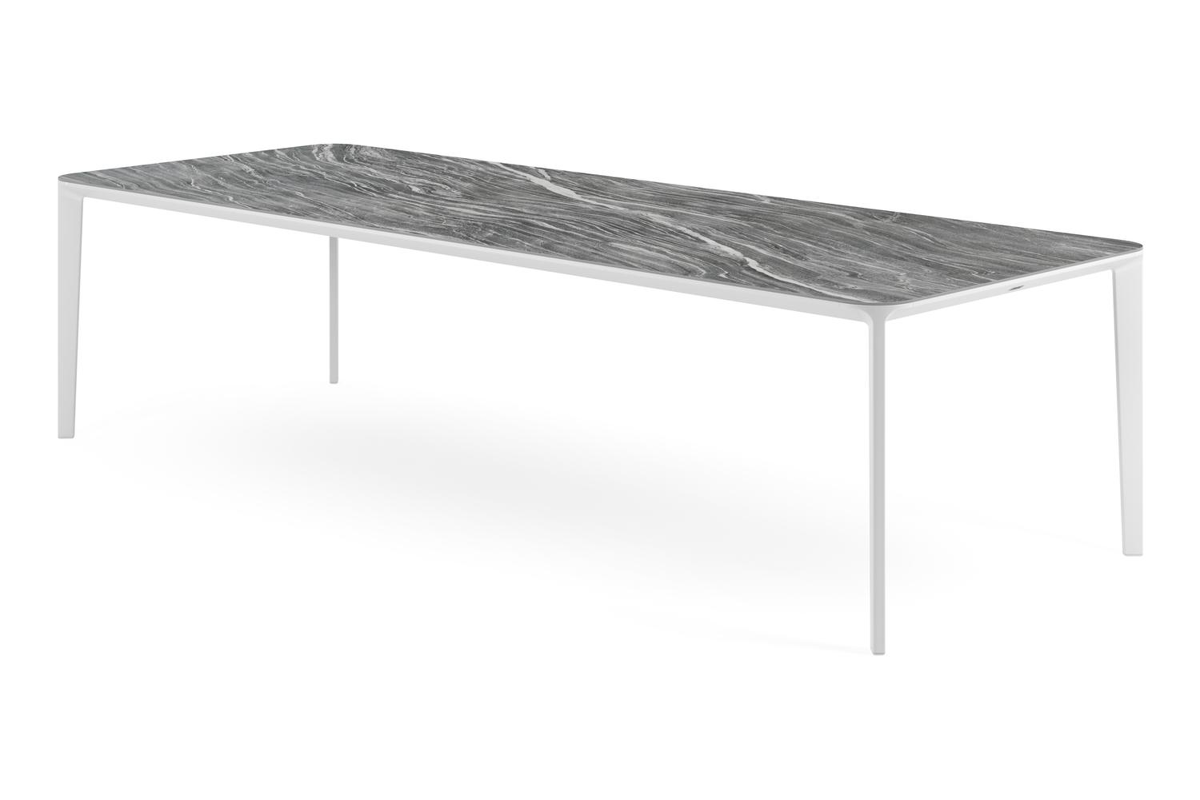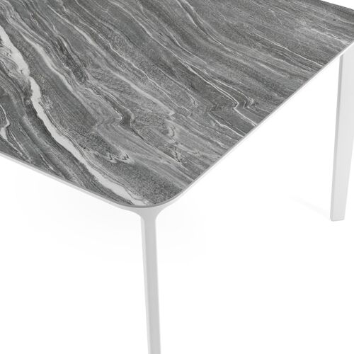 De Urbino tafel heeft een moderne uitstraling met speelse touch. De tafelpoten hebben afgeronde vormen en bovenaan hebben ze een unieke Y-vorm. Deze tafel is afgewerkt met een Mar Del Plata tafelblad. Een uniek tafelblad waarin de golven van de zee weerspiegelen. In de tafel vind je glinsterende spikkels die zorgen voor een prachtig parelmoereffect. Het voordeel van volkeramische tafelbladen is dat ze krasbestendig zijn en bestand zijn tegen alle weersomstandigheden.