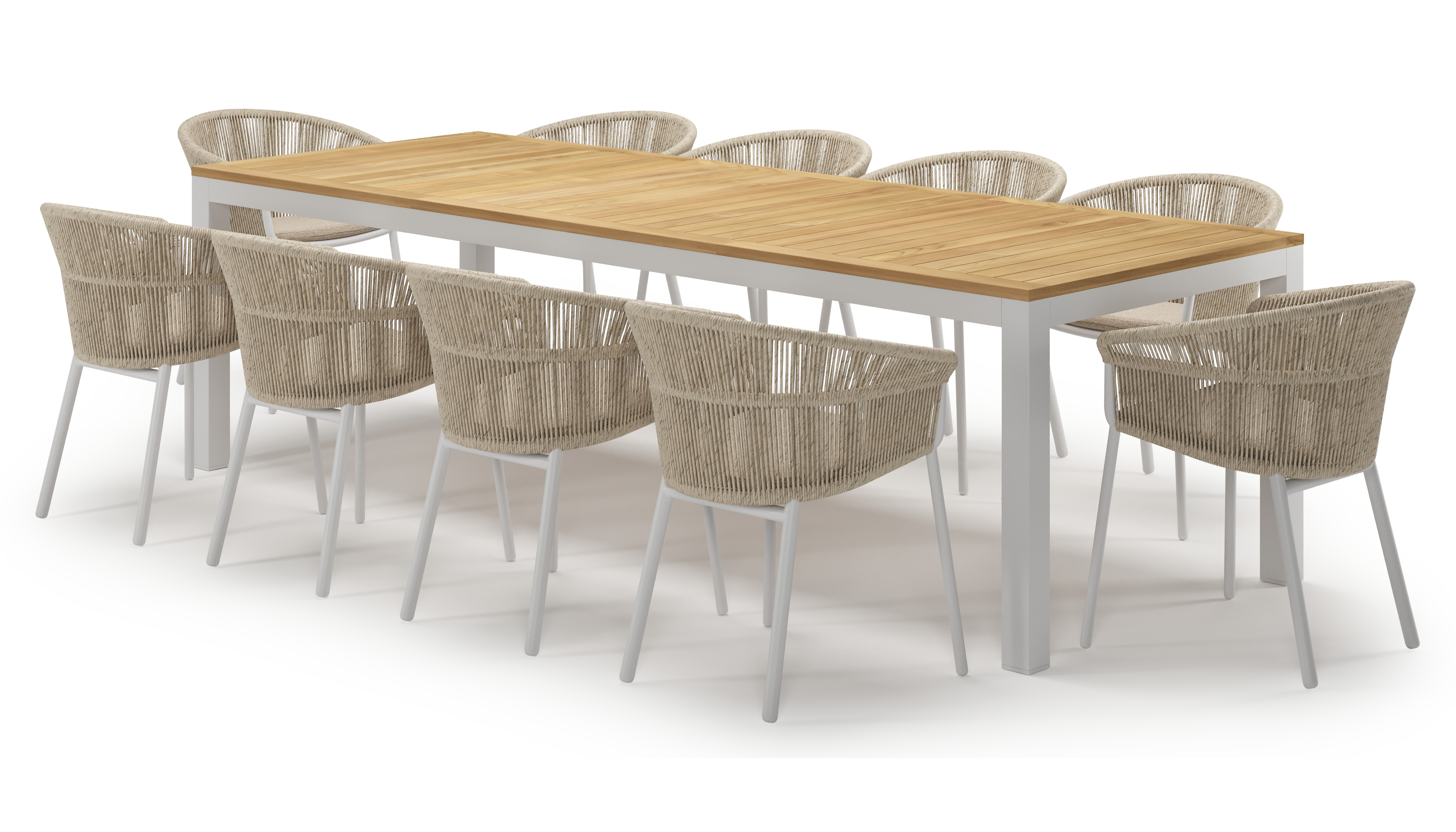 De Varese tuinset heeft een minimalistisch design dat perfect past binnen elke omgeving. De tuinset heeft een fijne afwerking en een breder tafelblad, waardoor je geniet van een extra zitplek aan de kopse kanten. Het frame van de tuintafel is gemaakt uit roestvrij aluminium, een sterk, maar toch licht materiaal dat makkelijk verplaatsbaar is. Het oppervlak is glad afgewerkt waardoor het geen vuil aantrekt en onderhoudsvriendelijk is. De poedercoating zorgt voor de UV- en weerbestendigheid van je meubel. Een teak tafelblad staat gelijk aan bijzondere kwaliteit en natuurlijk design. Teak is een kwalitatieve houtsoort gekenmerkt door zijn hardheid. Aangezien hout leeft, kan de structuur of kleur licht anders zijn dan op het beeld weergegeven.