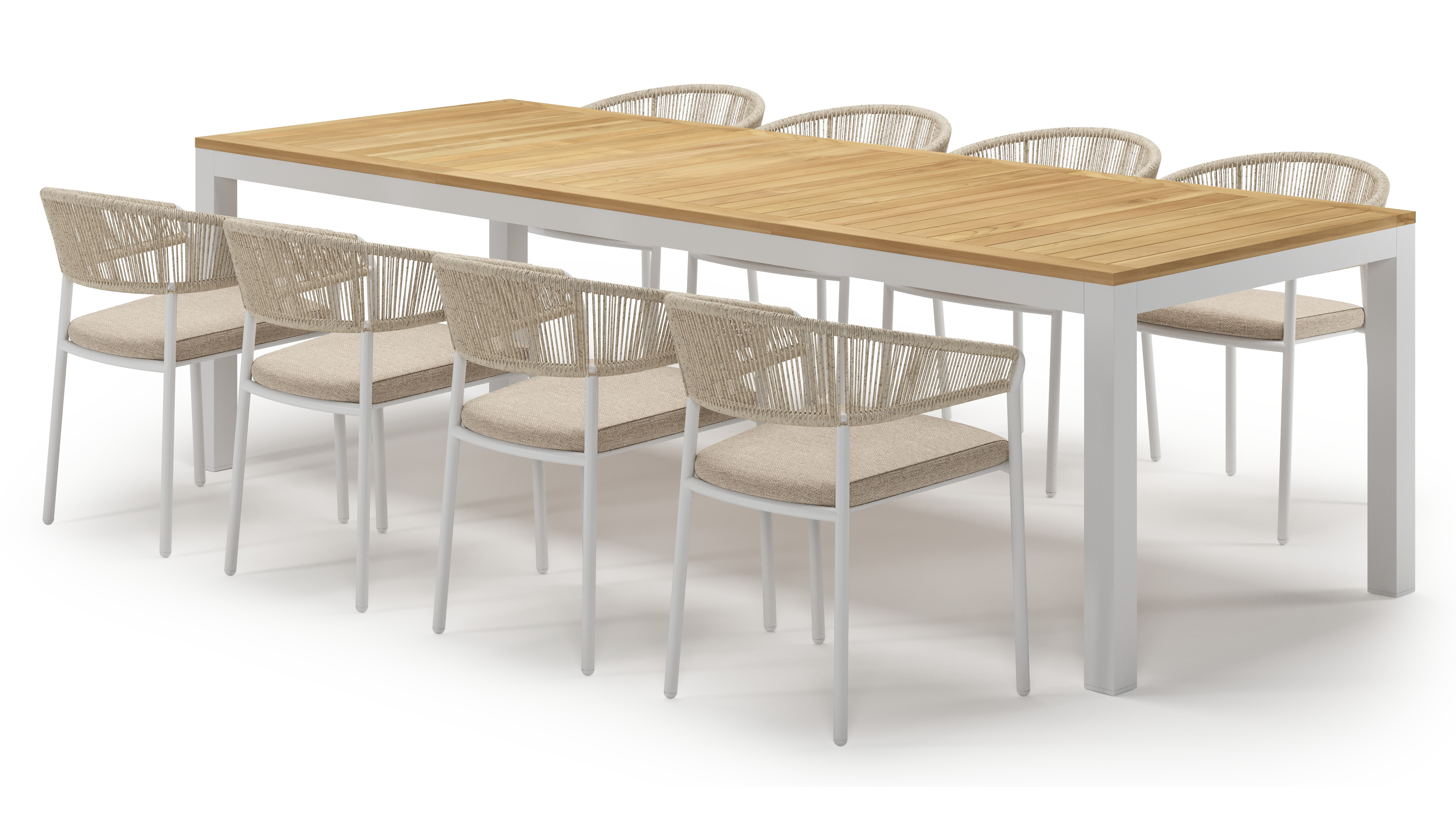 De Varese tuinset heeft een minimalistisch design dat perfect past binnen elke omgeving. De tuinset heeft een fijne afwerking en een breder tafelblad, waardoor je geniet van een extra zitplek aan de kopse kanten. Het frame van de tuintafel is gemaakt uit roestvrij aluminium, een sterk, maar toch licht materiaal dat makkelijk verplaatsbaar is. Het oppervlak is glad afgewerkt waardoor het geen vuil aantrekt en onderhoudsvriendelijk is. De poedercoating zorgt voor de UV- en weerbestendigheid van je meubel. Een teak tafelblad staat gelijk aan bijzondere kwaliteit en natuurlijk design. Teak is een kwalitatieve houtsoort gekenmerkt door zijn hardheid. Aangezien hout leeft, kan de structuur of kleur licht anders zijn dan op het beeld weergegeven.