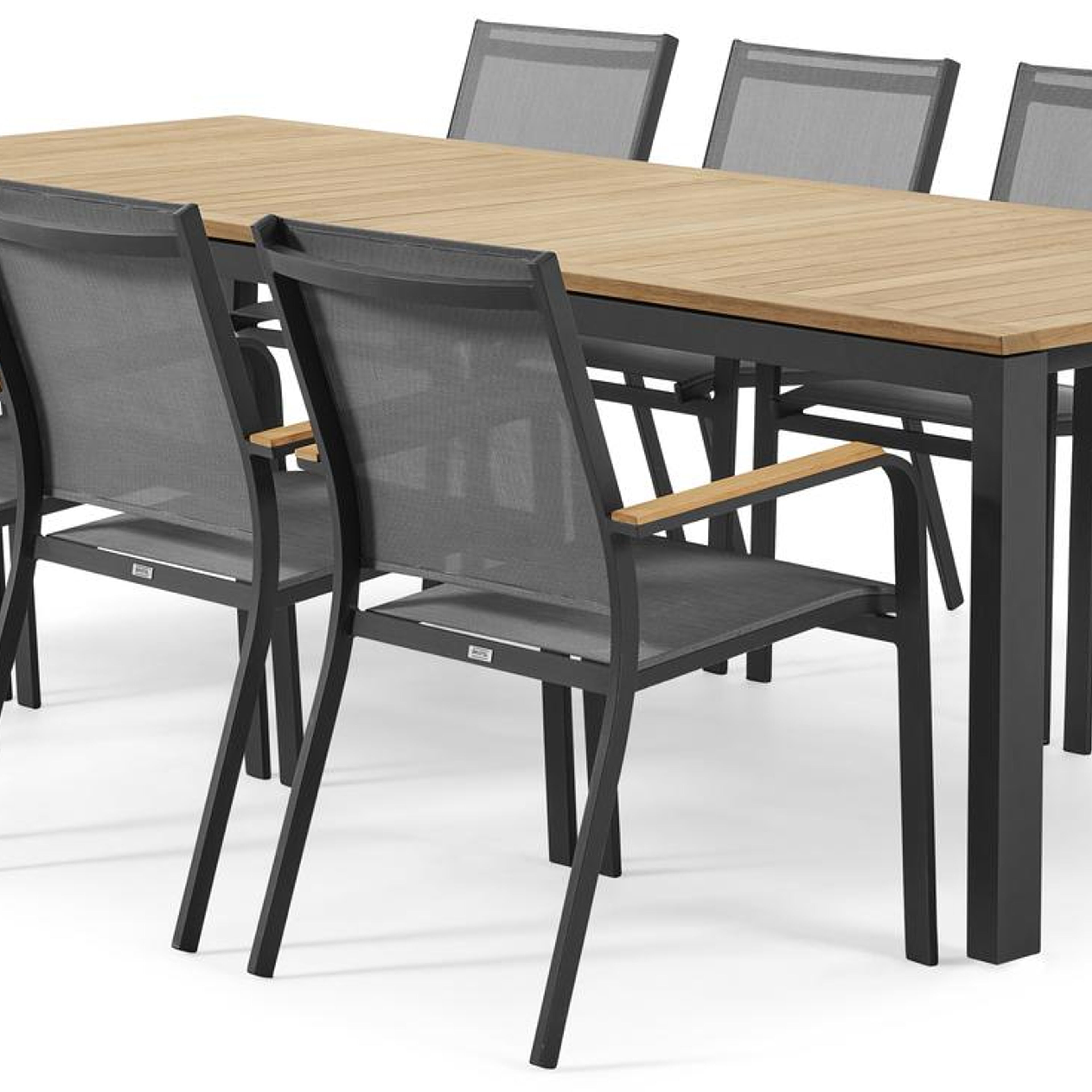 De Amalfi stoel is een stijlvolle stoel met afgeronde armleuningen en heeft een natuurlijke look uit door de armleuningen in teak. De Amalfi stoel heeft een frame uit roestvrij aluminium. De zitting en rugleuning zijn gemaakt uit stevige textilene, een stijlvol en onderhoudsvriendelijk materiaal. Verkrijgbaar in verschillende kleuren. De stoel is stapelbaar en dus makkelijk op te bergen.