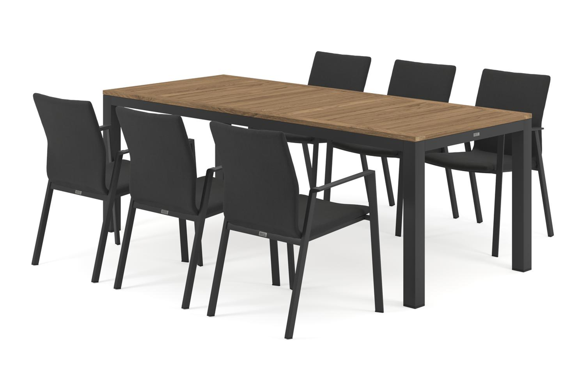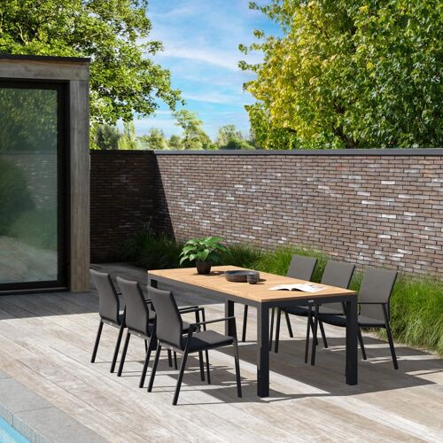Een tafelblad uit teak staat gelijk aan bijzondere kwaliteit en natuurlijk design. Teak is een kwalitatieve houtsoort gekenmerkt door zijn hardheid. Aangezien hout leeft, kan de structuur of kleur licht anders zijn dan op het beeld weergegeven.De Madura tuinset heeft een uniek design met een doorlopend tafelframe. Zowel de zijden als de poten zijn naar binnen afgerond.