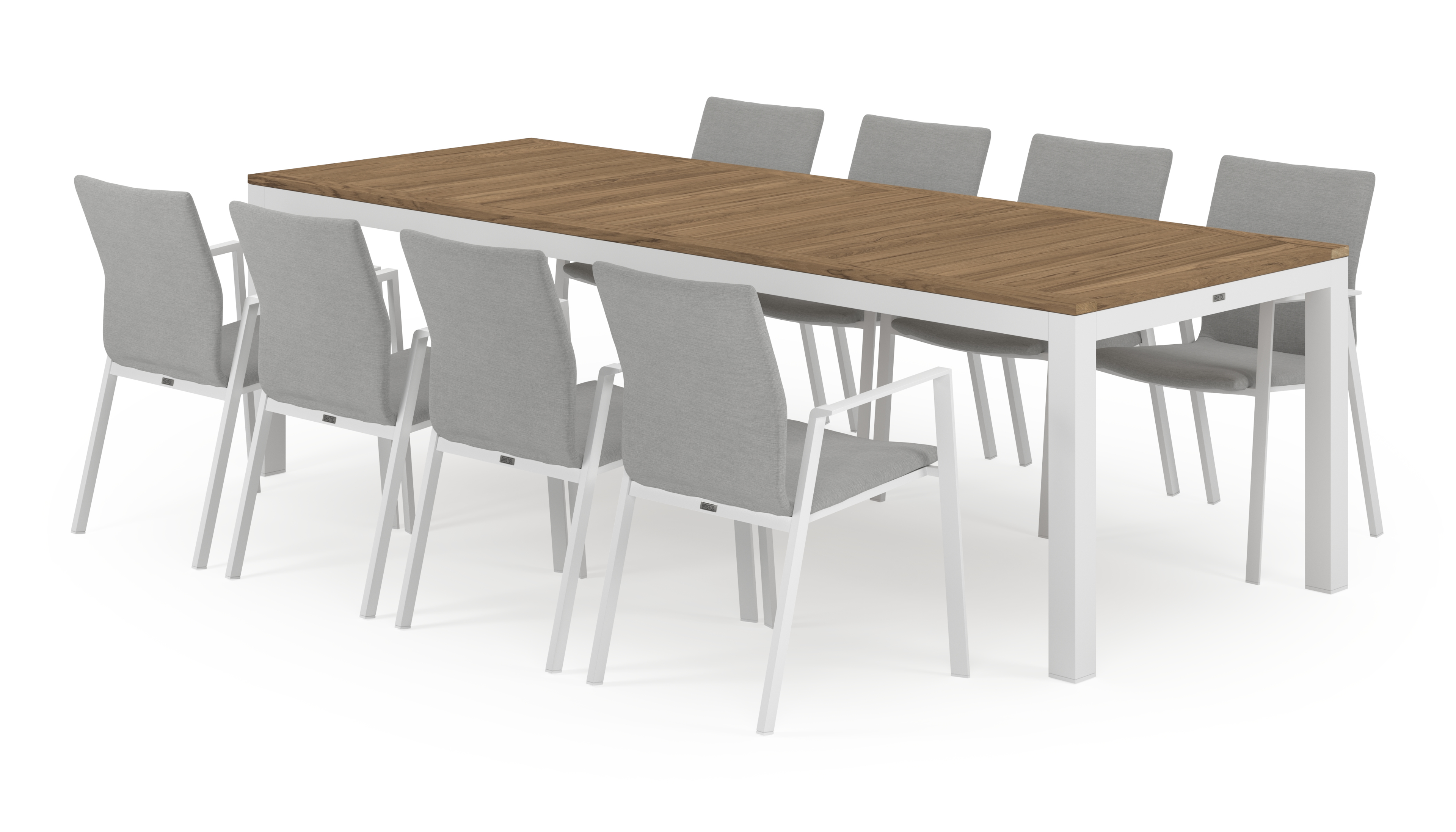 Varese tuinset in wit aluminium en naturel teak tafelblad met 8 stapelbare Madura tuinstoelen | Exterioo tuinmeubelen