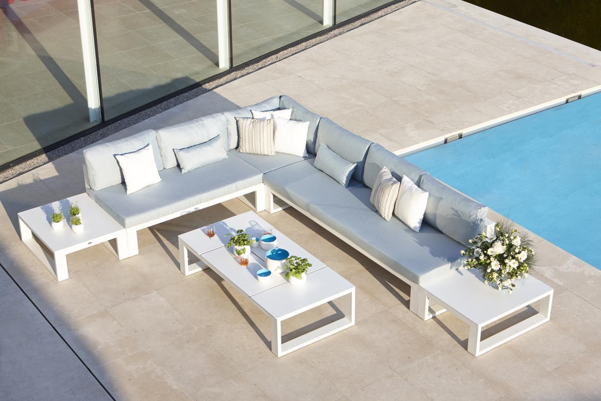 Complete loungeset in wit aluminium. Comfort zit- en rugkussens uit all-weather stof. Kleur: Natte Frosty Chine. Afmeting loungehoek: B 322 x D 244 x H 63 cm. Loungetafel volledig in wit aluminium met 4 "Folding tops" die uitklapbaar zijn. Afmeting: B 160 x D 80 x H 39,5 cm. Bijzettafels in wit aluminium. Afmeting: B 88 x D 73 x H 32 cm. *1x Verato loungehoek *1x Verato loungetafel *1x Verato bijzettafel