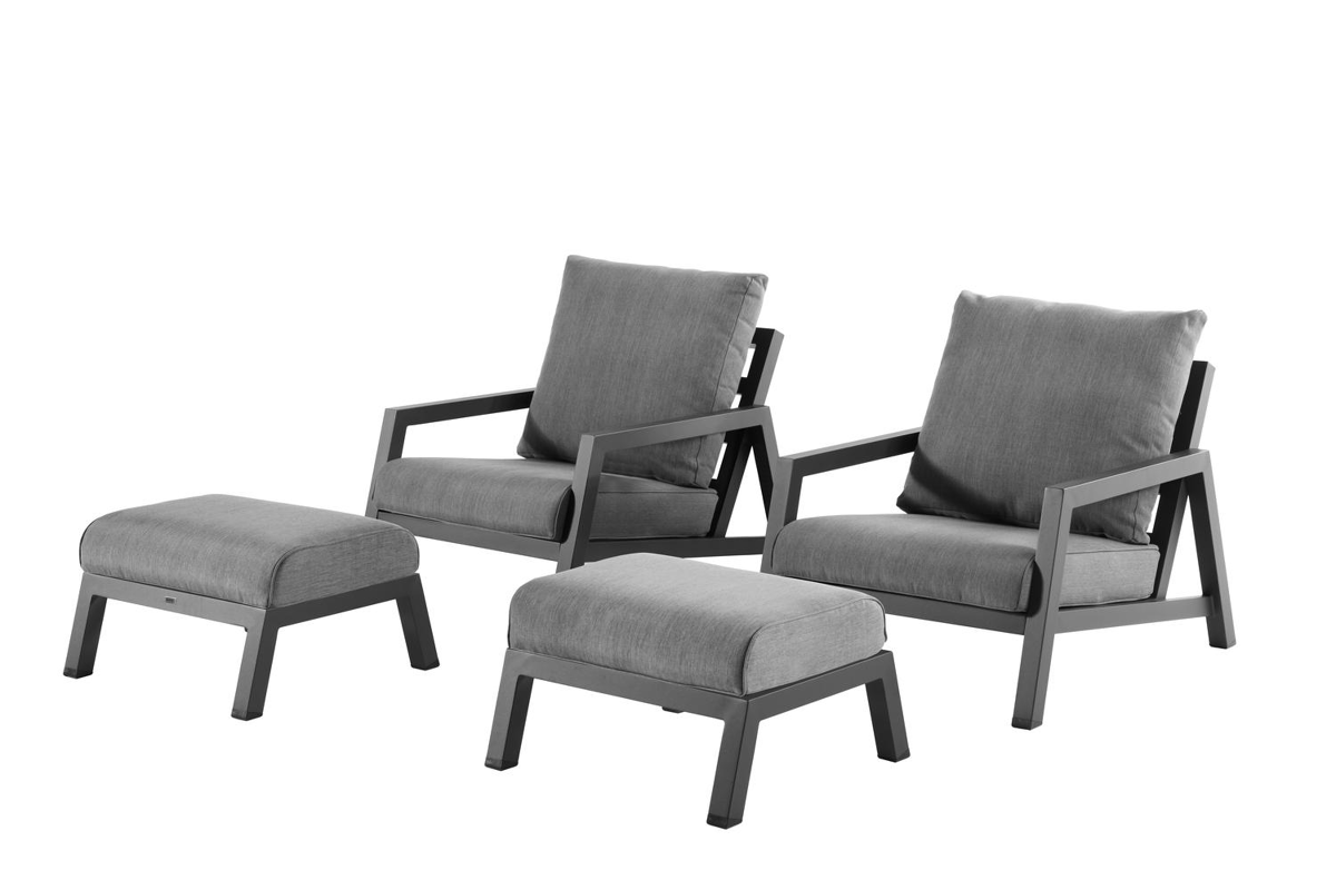 Loungeset met frame in aluminium (zwart). Met zit- en rugkussens in Weather+ Softtextilene. Kleur: grijs. De loungeset bestaat uit een 2x 1-zit (B 80 x D 101 x H 73 cm), 2x voetensteun (B 66 x D 63 x H 24,5 cm) en zit- en rugkussens. Er is plaats voor 2 tot 4 personen.